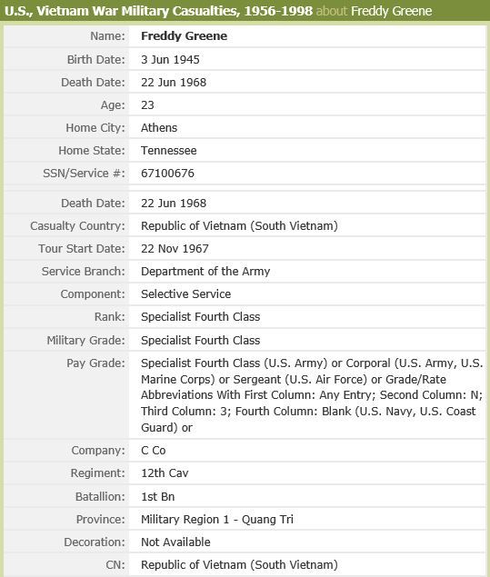 The United States Army presented posthumously the Silver Star Medal, Bronze Star Medal, Air Medal and the Purple Heart Medal to the parents of Specialist Fourth Class Freddy Green who was killed in action in South Vietnam on June 22, 1968. Freddy was the son of Mr. and Mrs. Emory Greene of Route # 1, Athens, TN. The Silver Star was earned for gallantry in action against the enemy as a member of the 1st Battalion Airborne, 12th Calvary.