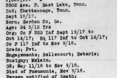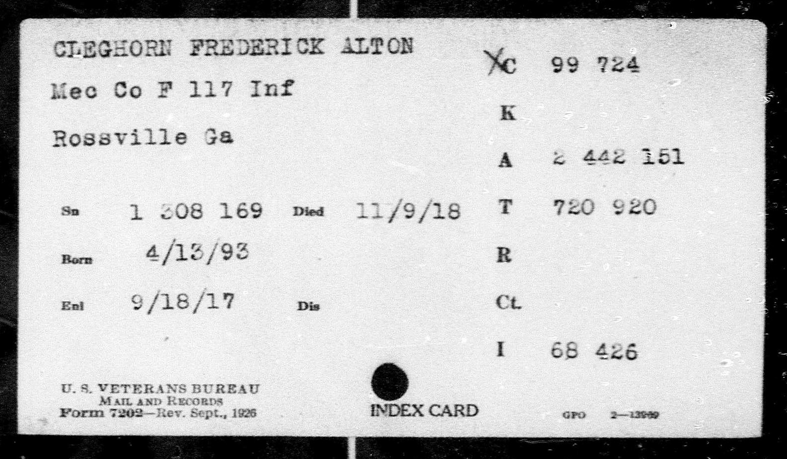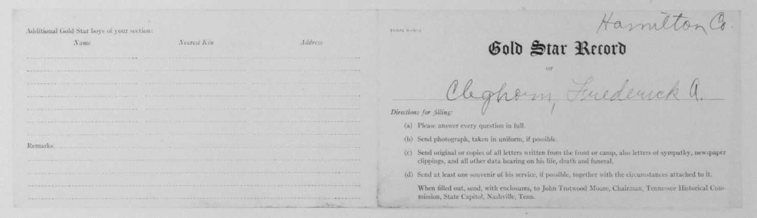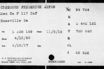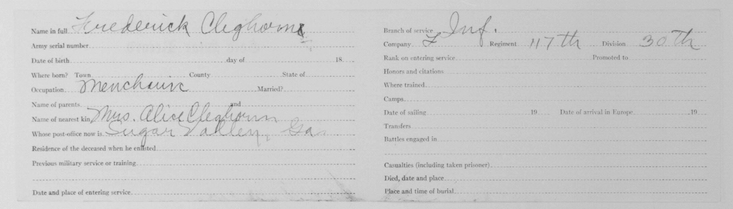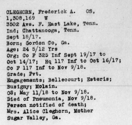 Frederick or Fredrick Alton Cleghorn was born in Sugar Valley, Gordon County, Georgia to Henry S. Cleghorn and Alice Harriett Abbott. Listed under Hamilton County in State records. He was employed in Chattanooga and residing in East Lake, Chattanooga when he entered the service in 1917. He died of pneumonia in France.