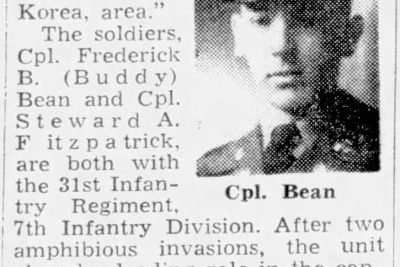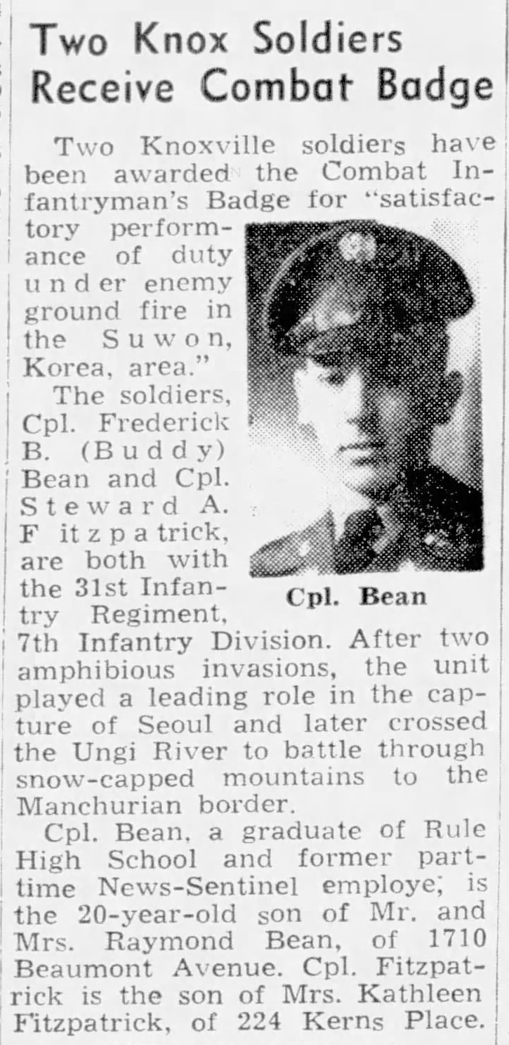 The soldiers, Cpl. Frederick B. (Buddy) Bean and Cpl. Steward A. Fitzpatrick, are both with the 31st Infantry Regiment, 7th Infantry Division. After two amphibious invasions, the unit played a leading role in the capture of Seoul and later crossed the Ungi River to battle through snow-capped Mountains to the Manchurian border. Cpl. Bean, a graduate of Rule High School, and former Partime News-Sentinel employe, is the 20-year-old son of Mr. and Mrs. Raymond Bean, of 1710 Beaumont Avenue.