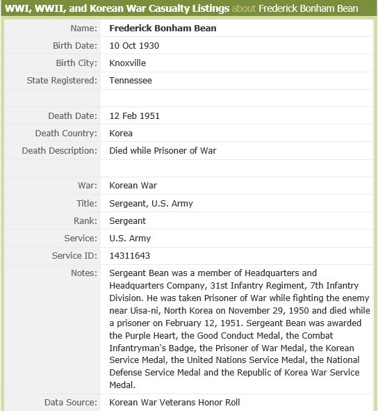 NOTE: Another on the Memorial, William C. Jenkins, also was in the 31st Infantry Regt., 7th ID, and he died on the day that Bean was captured, November 29, 1950. See: https://etvma.org/veterans/william-c-jenkins-11491/
