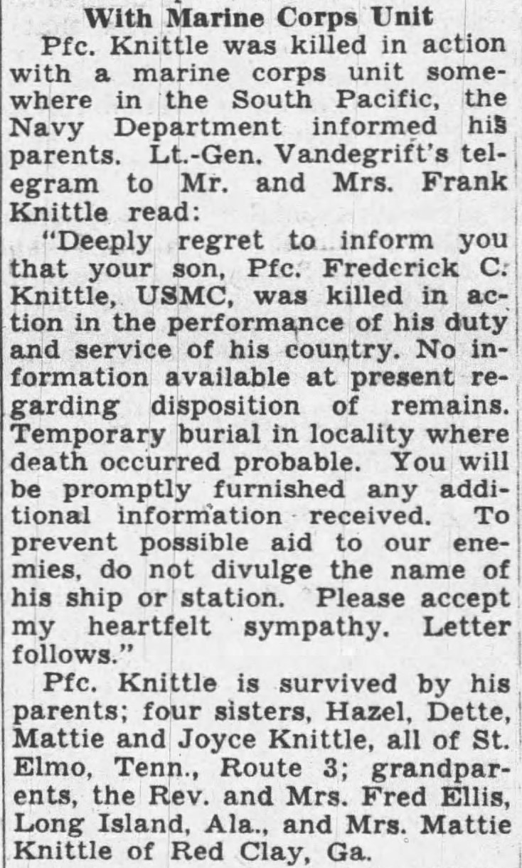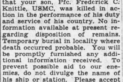 Pfc. Knittle was killed in action with a marine corps unit somewhere in the South Pacific, the Navy Department informed his parents. Lt.-Gen- Vandegrift’s telegram to Mr. and Mrs. Frank Knittle read: “Deeply regret to inform you that your son, Pfc. Frederick C. Knittle, USMC, was killed in action in the performance of his duty and service of his country. No information available at present regarding disposition of remains. Temporary burial in locality where death occurred probable. You will be promptly furnished any additional information received. To prevent possible aid to our enemies, do not divulge the name of his ship or station. Please accept my heartfelt sympathy. Letter follows.”