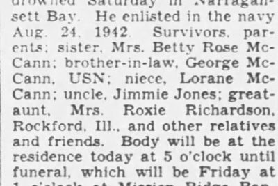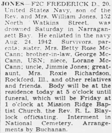 F2C Frederick D. Jones, 20, USN, son fo William Jones, 152 Watkins Street, drowned Saturday in Narragansett Bay. The drowning occurred when three of the men jumped into the water to save a sailor who fell off a 5-foot mail and Liberty boat. One of the four was rescued.
