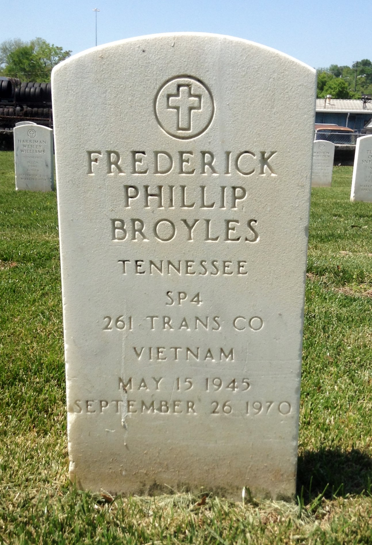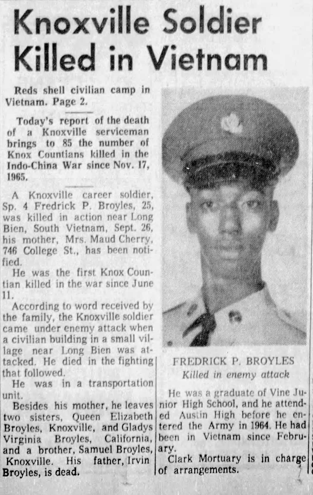 A Knoxville Career soldier, Sp. 4 Frederick P. Broyles, 25, was killed in action near Long Bien, South Vietnam, Sept. 26, his mother, Mrs. Maud Cherry, 746 College St., has been notified. He was the first Knox Countian killed in the war since June 11. According to word received by the family, the Knoxville soldier came under enemy attack when a civilian building in a small village near Long Bien was attacked. He died in the fighting that followed. He was in a transportation unit. Besides his mother, he leaves two sisters, Queen Elizabeth Broyles, Knoxville, and Gladys Virginia Broyles, California, and a brother, Samuel Broyles, Knoxville. His father, Irvin Broyles is dead. He was a graduate of Vine Junior High School, and he attended Austin High before he entered the Army in 1964. He had been in Vietnam since February. Clark Mortuary is in charge of arrangements.