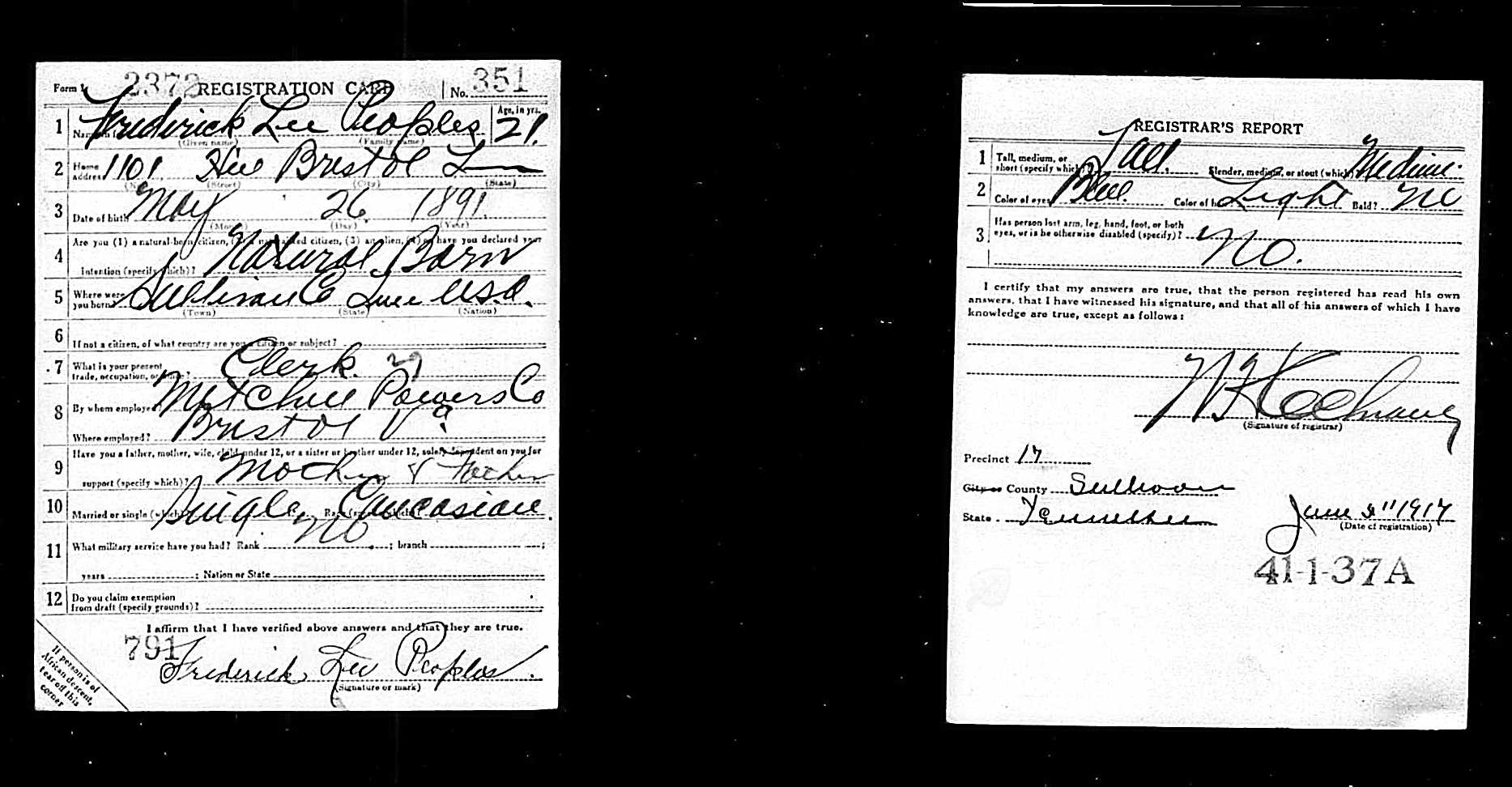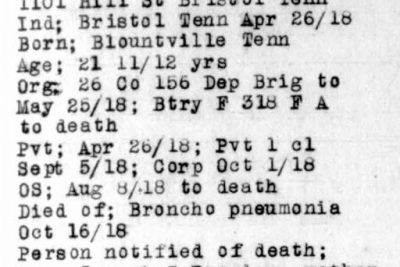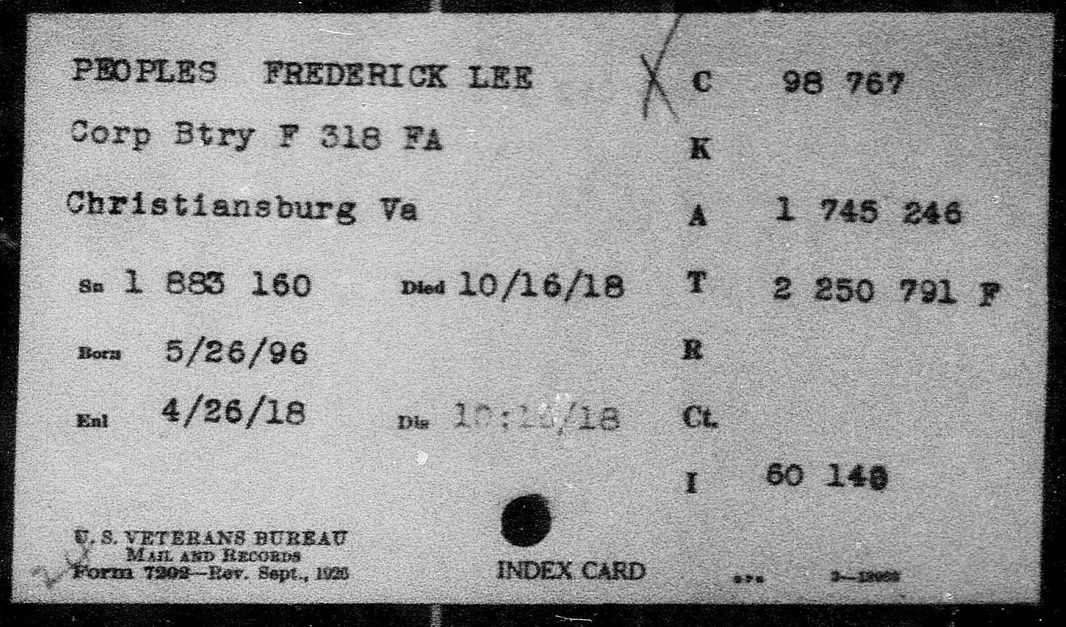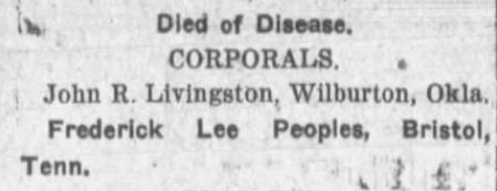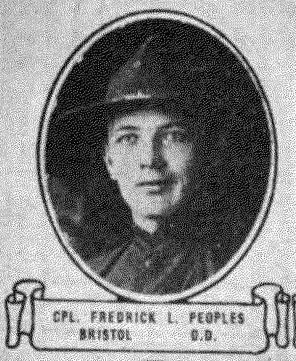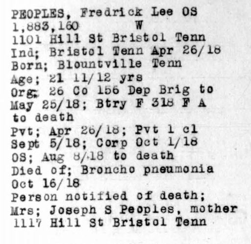 Fredrick Lee Peoples was born in Blountville, Tennessee to Joseph Sterling Peoples and Catherine Barnes. He enlisted in the Army at the age of 21. He died of broncho pneumonia in France.