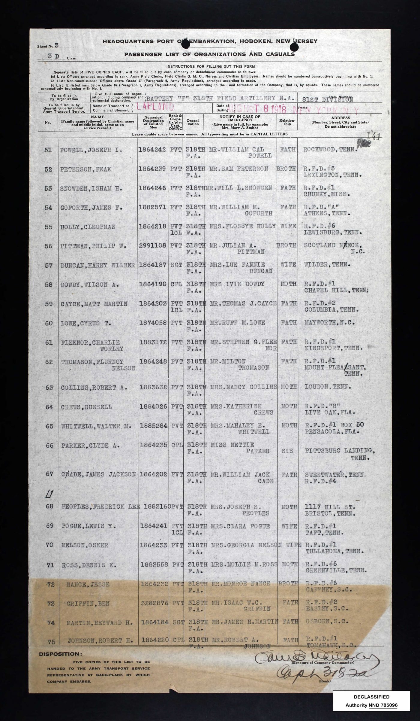 - Division/Assignment: Battery F, 318th Field Artillery