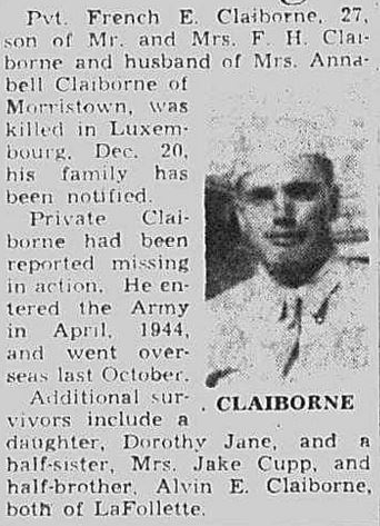 Pvt. French E. Claiborne, 27, son of Mr. and Mrs. F.H. Claiborne and husband of Mrs. Annabell Claiborne of Morristown, was killed in Luxembourg, Dec. 20, his family has been notified. Private Claiborne had been reported missing in action. He entered the Army in April, 1944, and went overseas last October. Additional survivors include a daughter, Dorothy Jane, and a half-sister, Mrs. Jake Cupp, and half-brother, Alvin E. Claiborne, both of LaFollette.