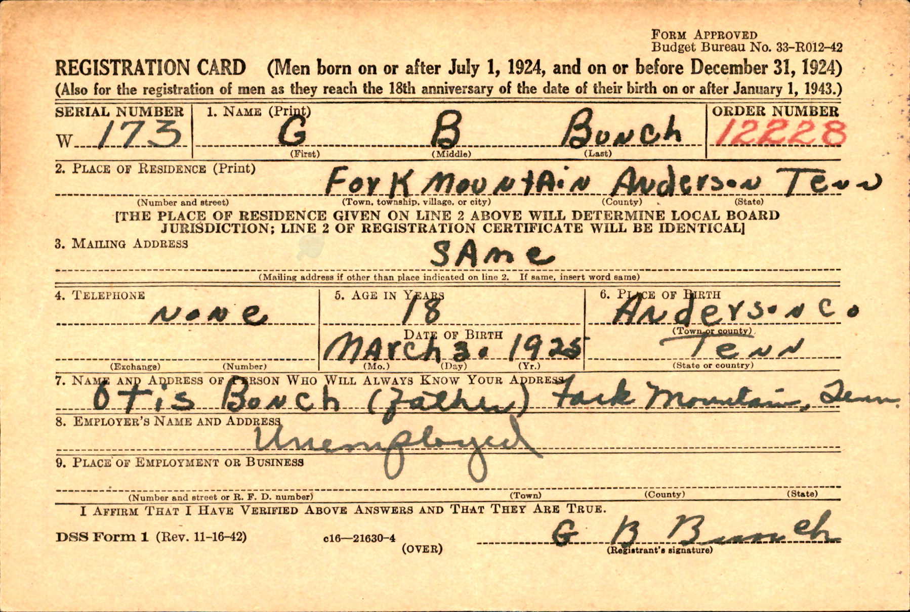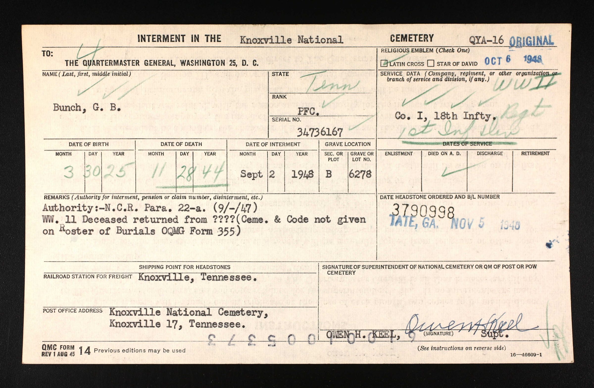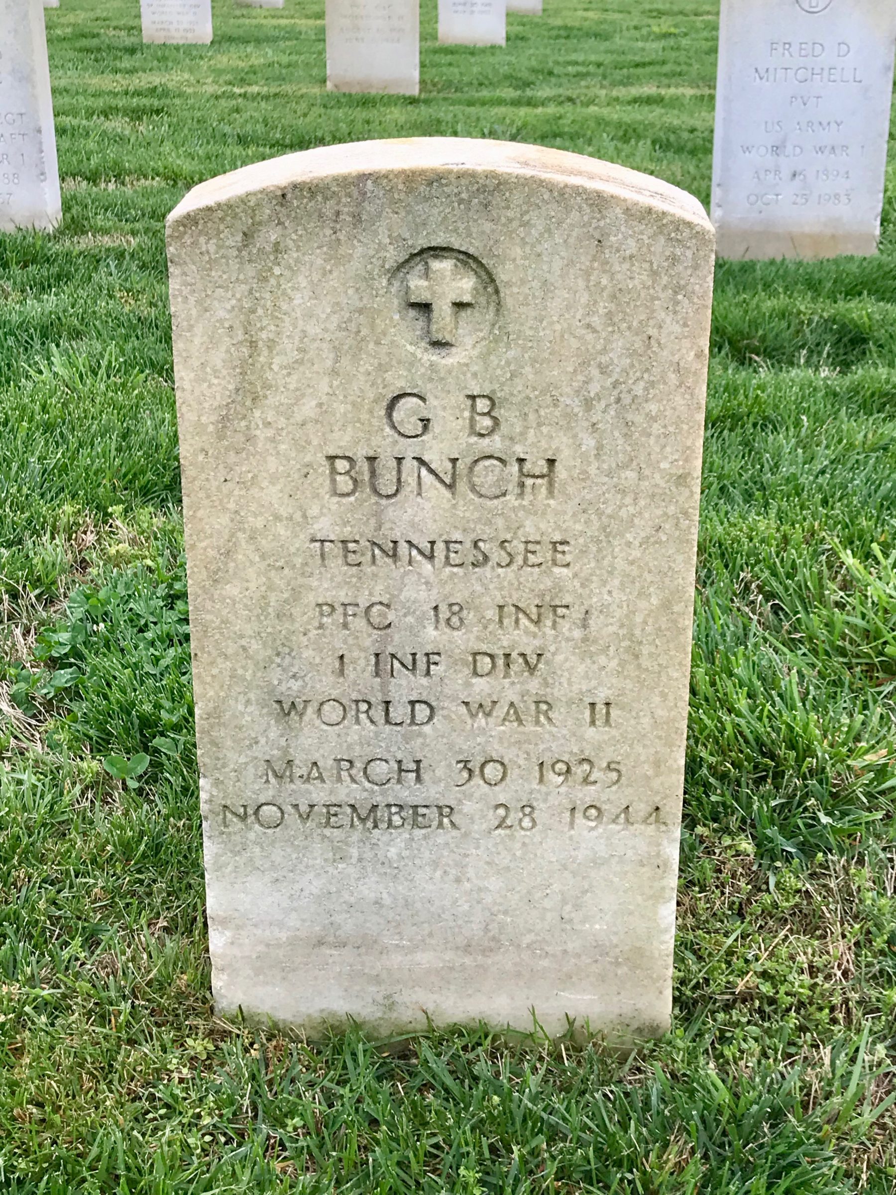 Private First Class G. B. Bunch was born on March 30, 1925, son of Otis Bunch and Verdie Massengill. Prior to joining the military, he worked as a farmer. He enlisted in the military on June 9, 1943 in Fort Oglethorpe, Georgia. He served in the 18th Infantry, 1st Infantry Division. He was killed in action on November 28, 1944 during the Hürtgen Forest Campaign and is buried in Knoxville National Cemetery (Section B, Site 6278, Row 32).