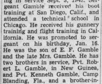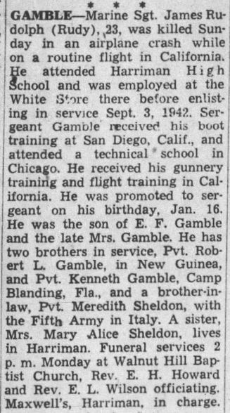Marine Sgt. James Rudolph Gamble (Rudy), 23, was killed Sunday in an airplane crash while on a routine flight in California. He attended Harriman High School and was employed at the White Store there before enlisting in service Sept. 3, 1942. Sergeant Gamble received his boot training at San Diego, Calif., and attended a technical school in Chicago. He received his gunnery training and flight training in California. He was promoted to sergeant on his birthday, Jan. 16. He was the son of E.F. Gamble and the late Mrs. Gamble. He has two brothers in service, Pvt. Robert L. Gamble, in New Guinea, and Pvt. Kenneth Gamble, Camp Blanding, Fla., and a brother-in-law, Pvt. Meredith Sheldon, with the Fifth Army in Italy. A sister, Mrs. Mary Alice Sheldon, lives in Harriman. Funeral services 2 p.m. at Walnut Hill Baptist Church.