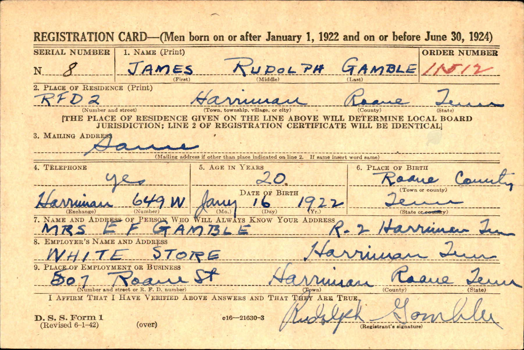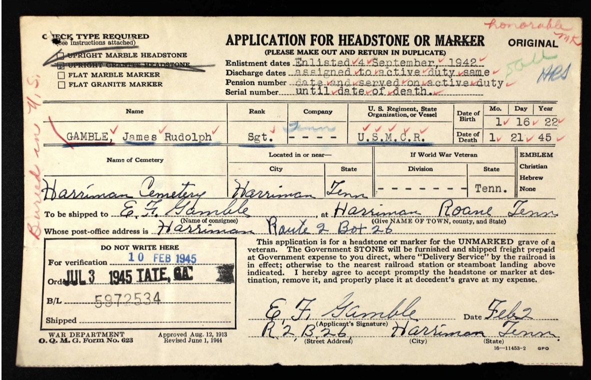 James Rudolph Gamble was in active service with the US Marine Corps Reserves. He was born on 16 January 1922 in Tennessee, son of Ethel Francis Gamble and Ella Mae Diggs. According to a 1940 census, he was still living in Harriman, TN.