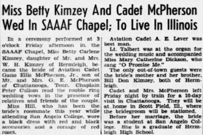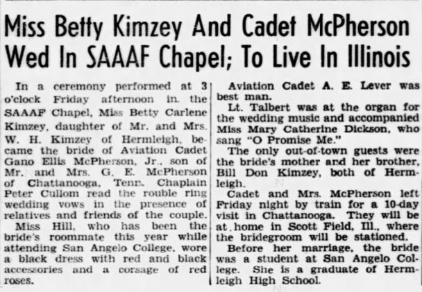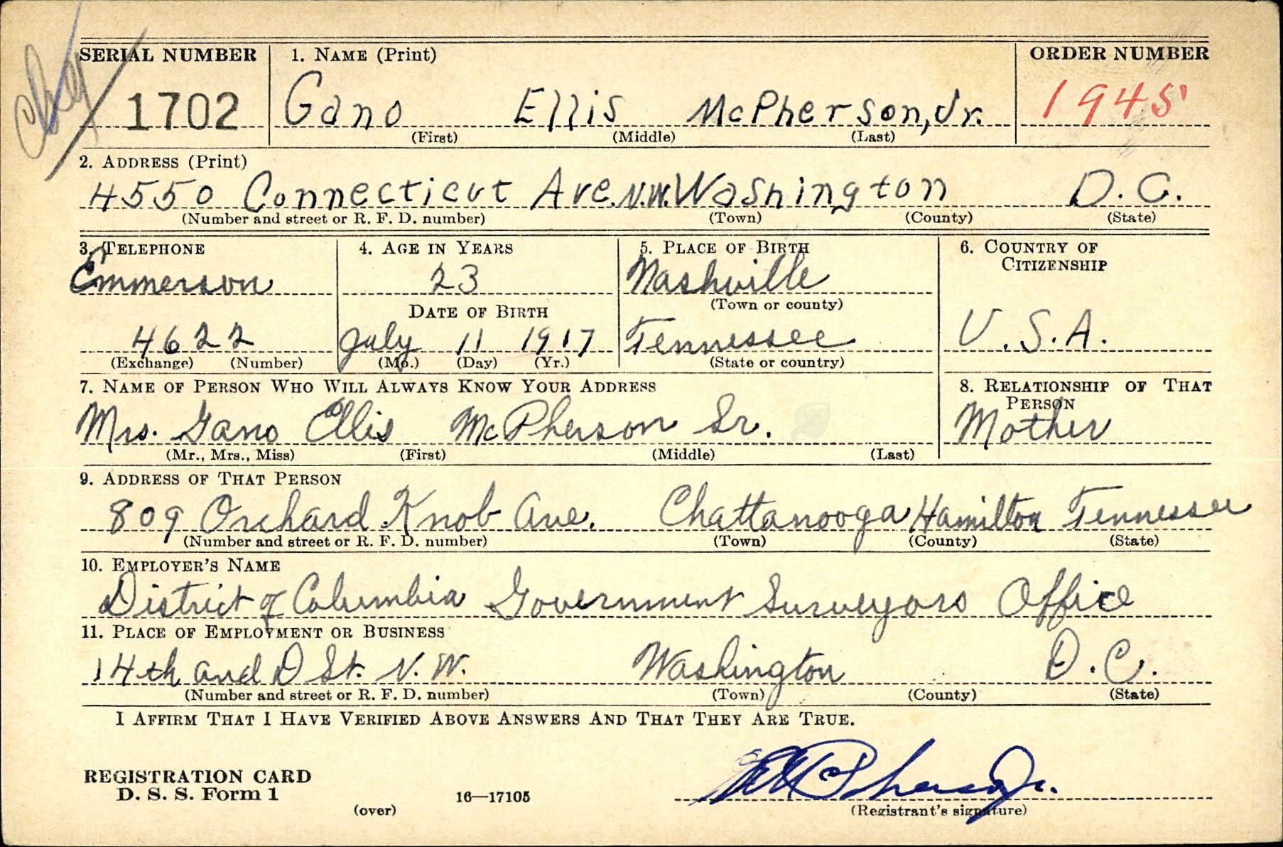 Gano Ellis McPherson Jr. was born in Nashville, Tennessee, the son of Gano Ellis McPherson Sr. and Minnie Mai Robinson. He married Betty Carlene Kimzey in 1944 and was the father of Sandy Gerry Ellis McPherson.