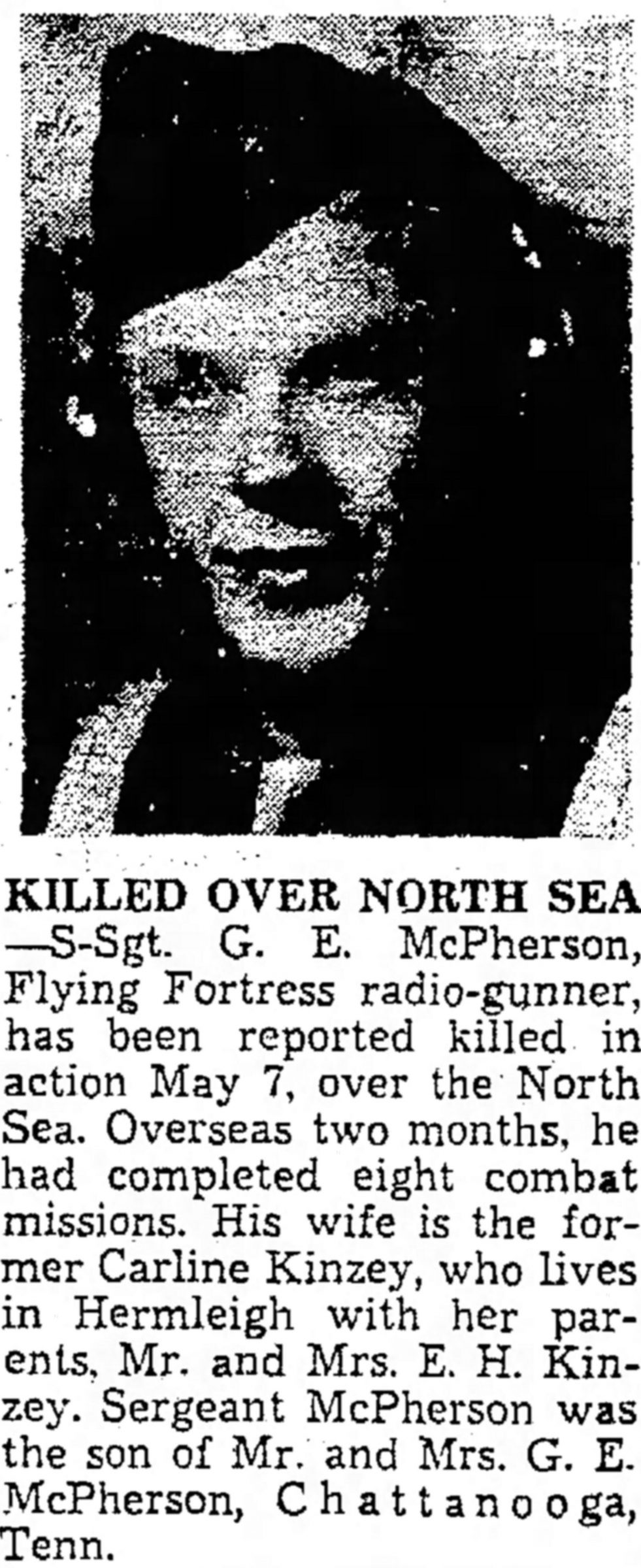 S/Sgt McPherson was killed when his plane with serial number 44-8640 crashed over the North Sea returning from a food supply mission to Holland. Memorialized at the Cambridge American Cemetery, Cambridge, England.