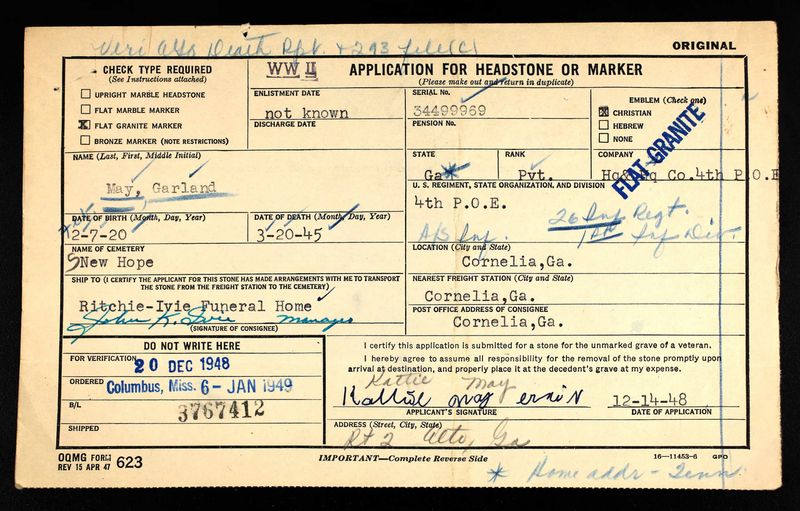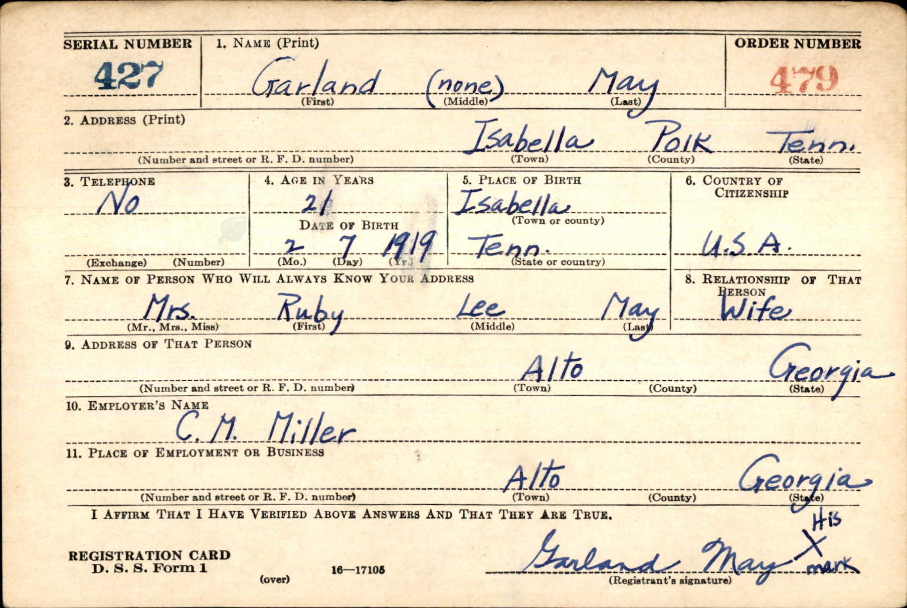 Garland May was born on 7 February 1920. He was the son of Columbus F. “Lum” May and Kate E. Cross. He was married to Ruby Lee May and the couple had one son, M. Cleo May. His wife and son died in 1941. Garland May married Dorothy Mary McAndrew. She lived in Exeter, Devon, England.