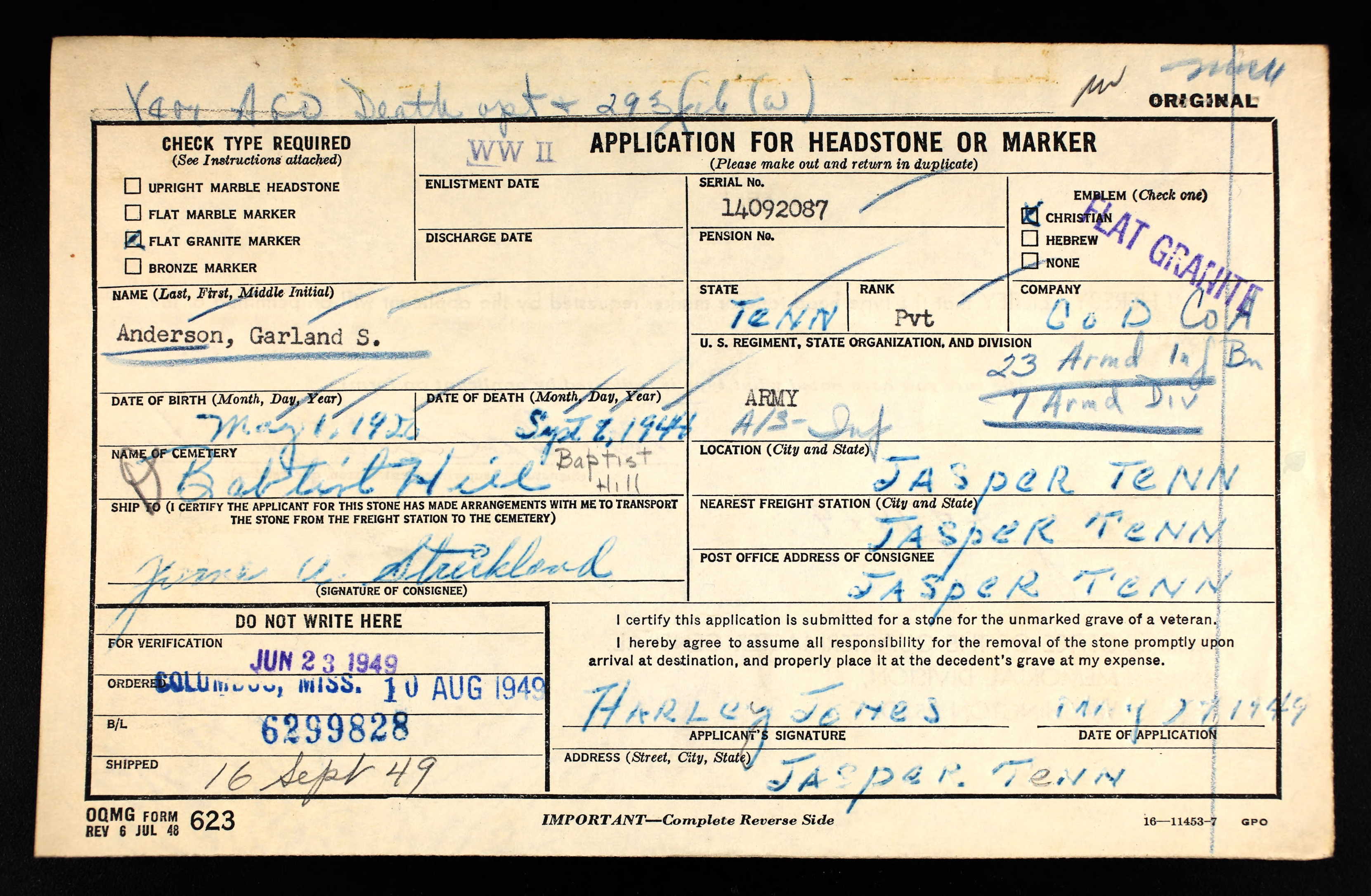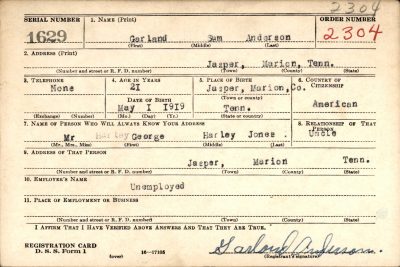 Garland Sam Born 1 May 1920 Anderson was born in Jasper, Tennessee. He was the son of Sam Hugh Anderson and Millie Jones.