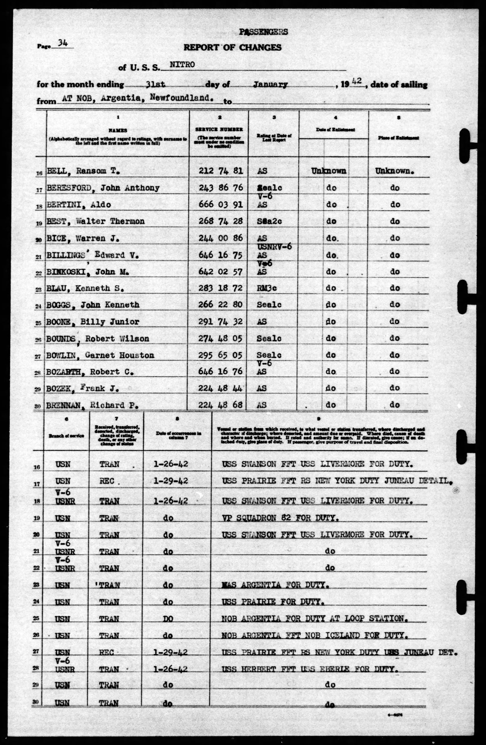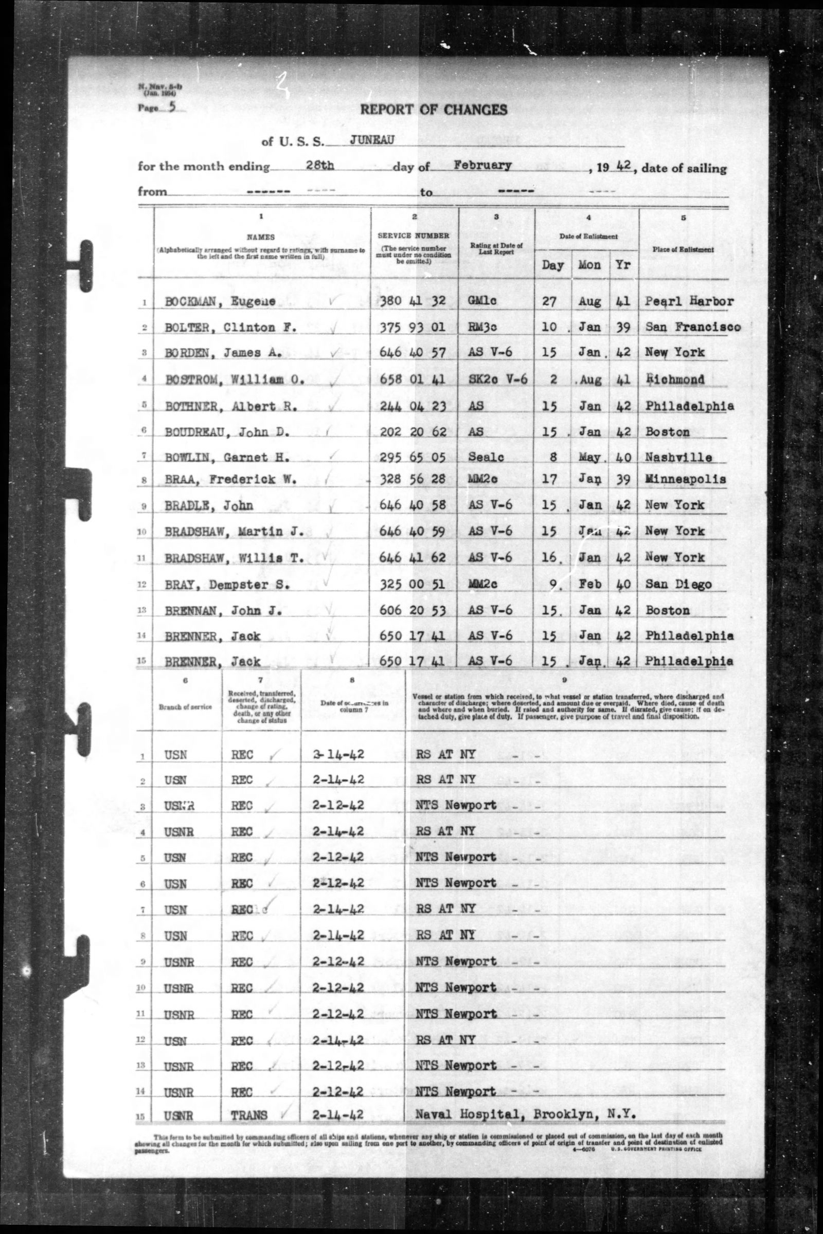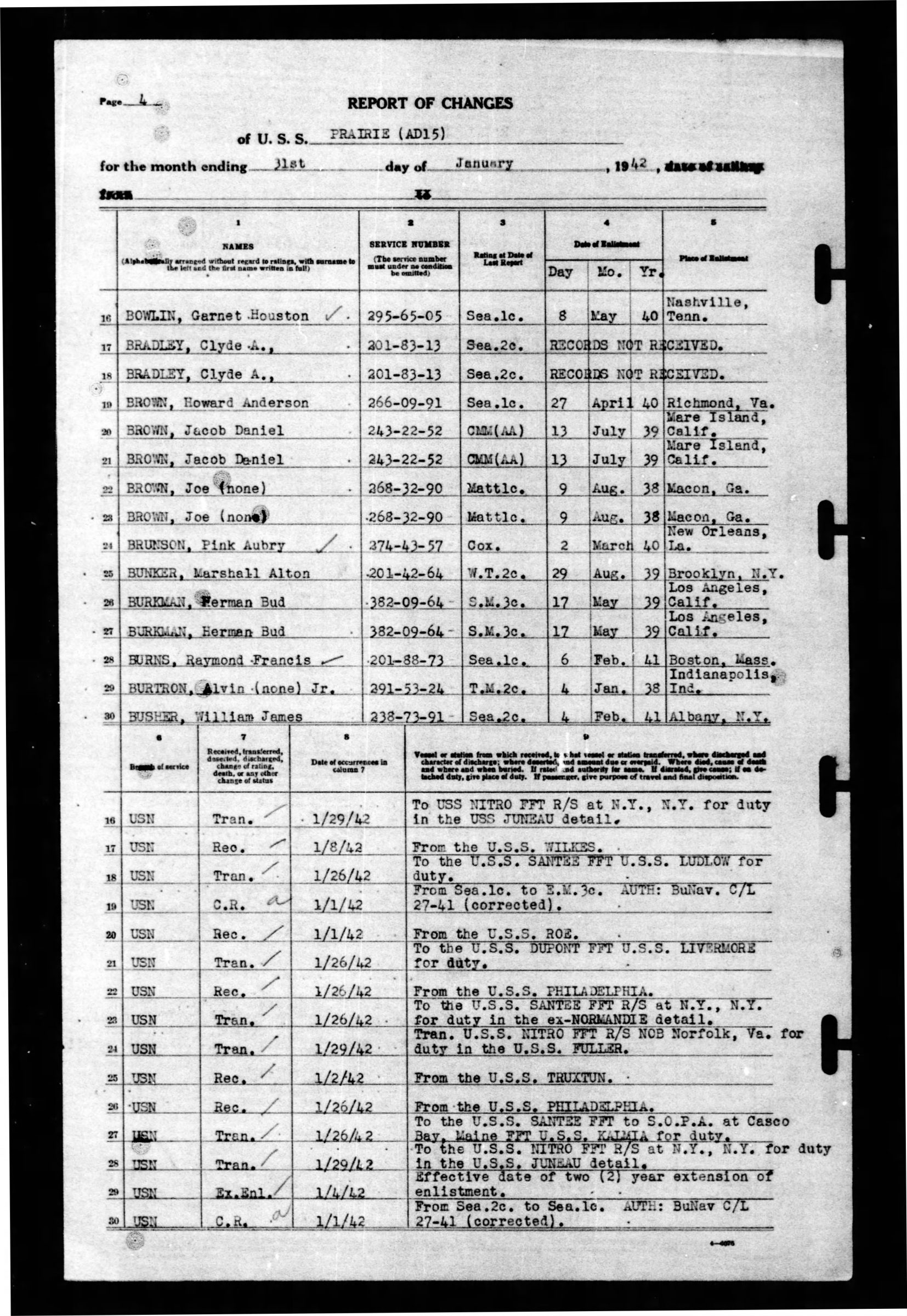 Garnet Bowlin served on the U.S.S. Prairie (AD15) and was transferred to the U.S.S. Nitro on 29 January 1942. On 14 February 1942 he was transferred to the U.S.S. Juneau.