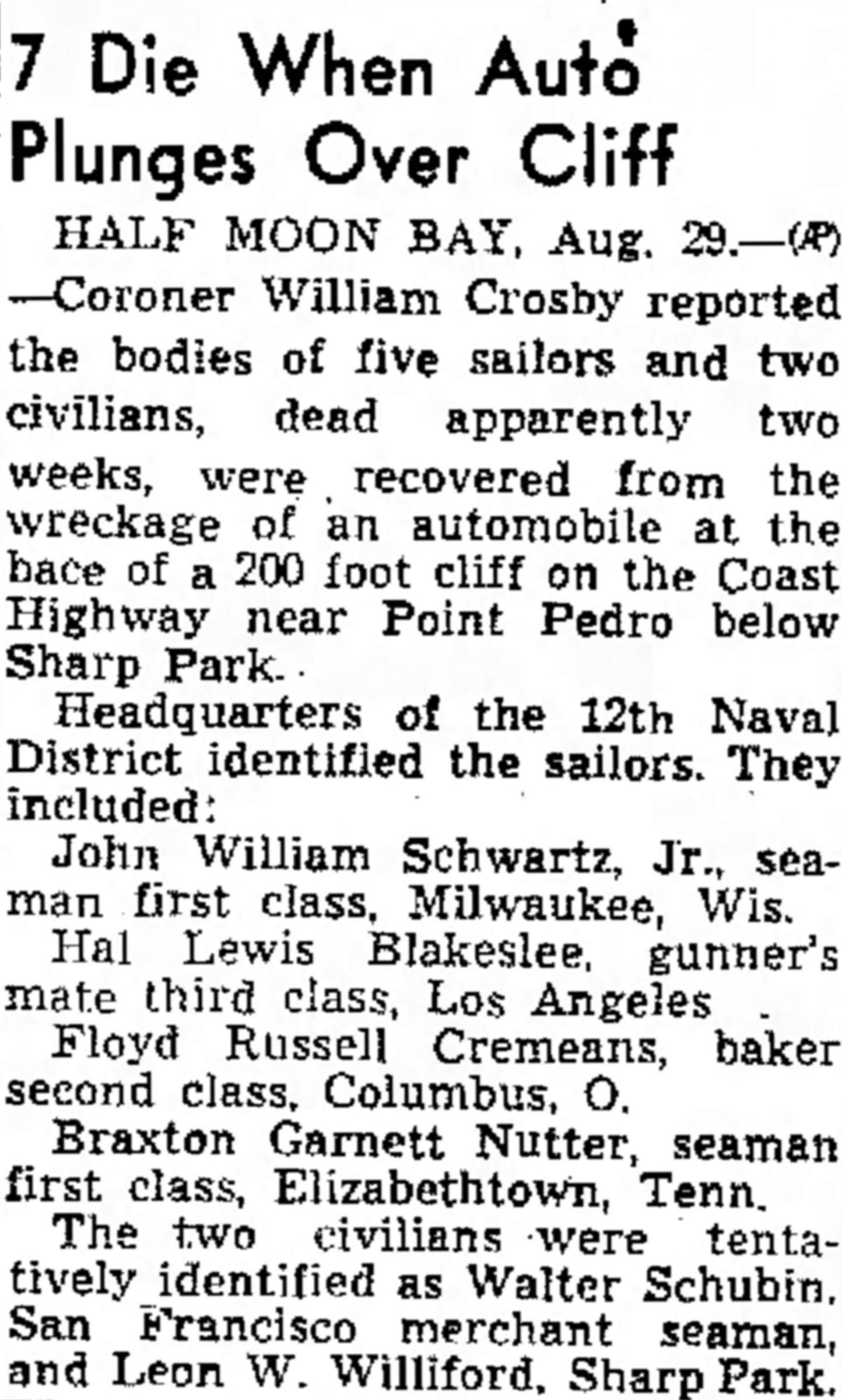 Half Moon Bay, Aug. 29 – Coroner William Crosby reported the bodies of five sailors and two civilians, dead apparently two weeks, were recovered from the wreckage of an automobile at the bace of a 200 feet cliff on the Coast Highway near Point Pedro below Sharp Park.