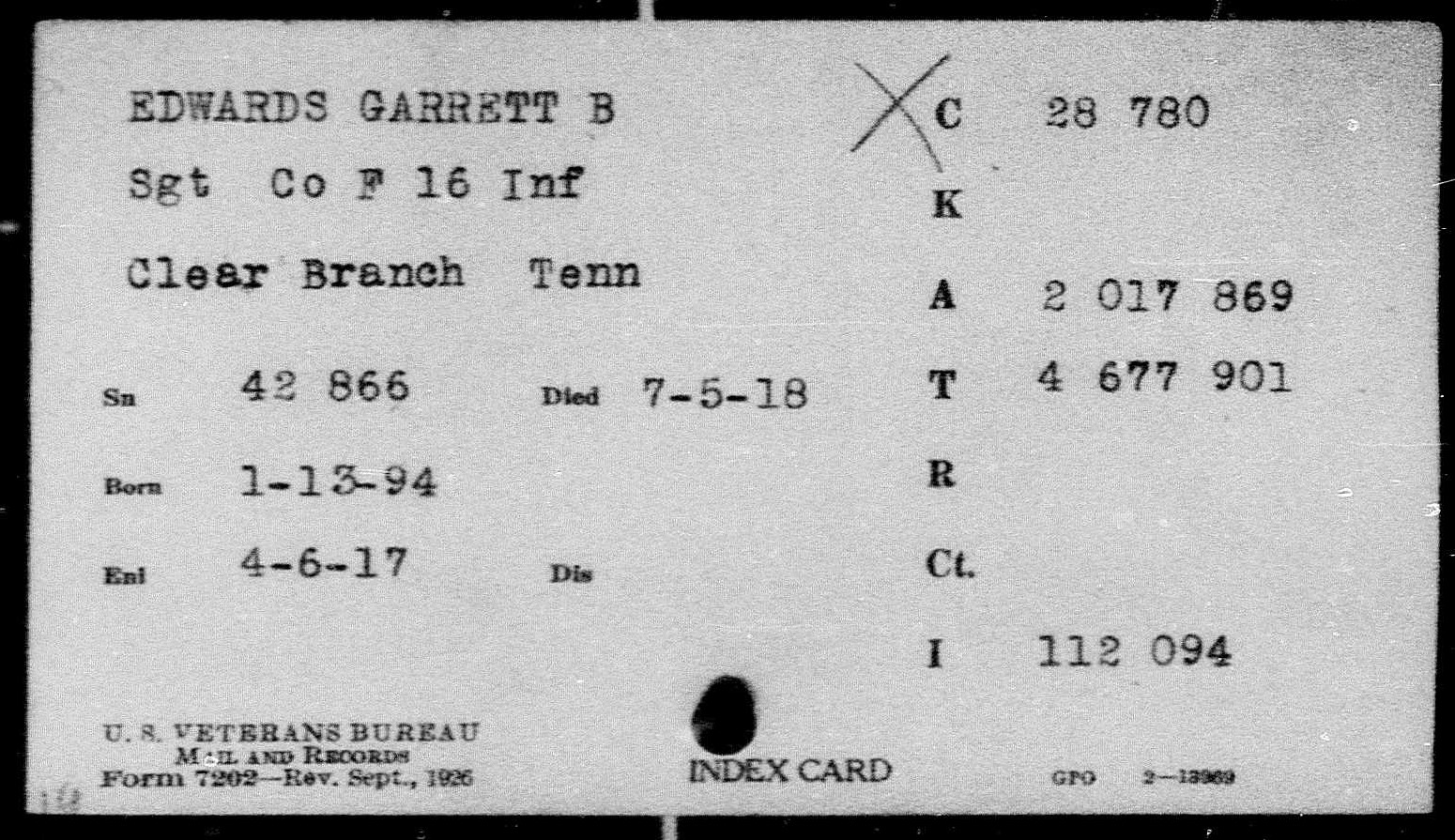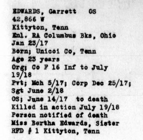 Garrett Edwards was killed in action and is memorialized at Tablets of the Missing at Aisne-Marne American Cemetery.