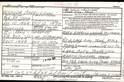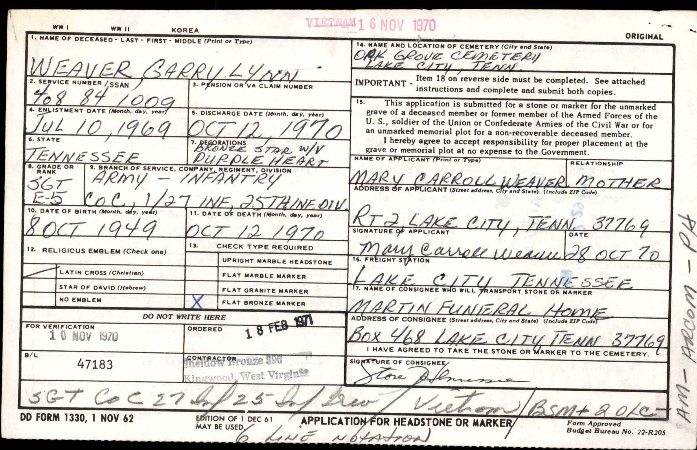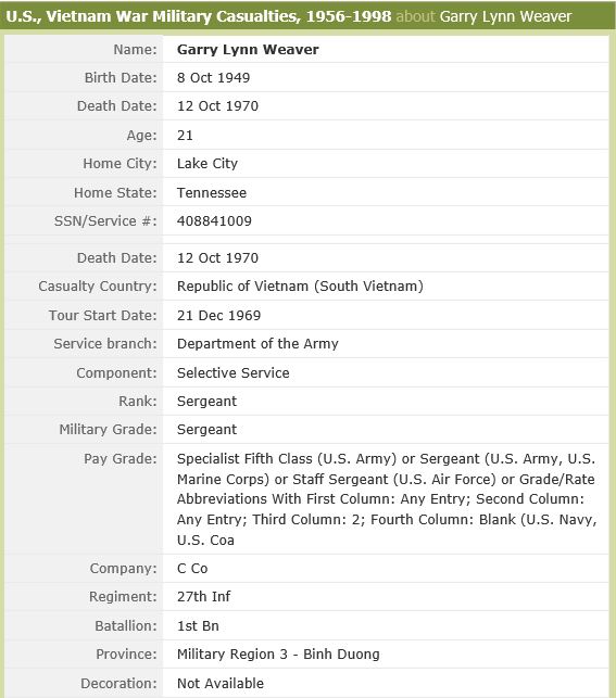 Garry Lynn Weaver was killed in action, October 12, 1970 at 11:40 AM in Binh Duong Province, Vietnam. He attended Lake City High School.