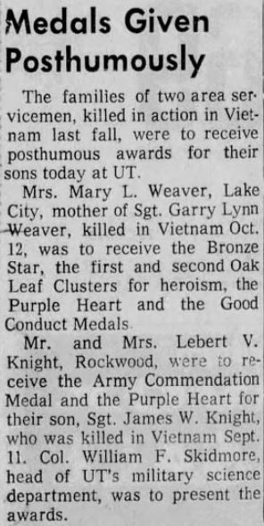The families of two area servicemen, killed in action in Vietnam last fall, were to received posthumous awards for their sons today at UT. Mrs. Mary L. Weaver, Lake City, mother of Sgt. Garry Lynn Weaver, killed in Vietnam Oct. 12, was to receive the Bronze Star, the first and second Oak Leaf Clusters for heroism, the Purple Heart and the Good Conduct Medals.