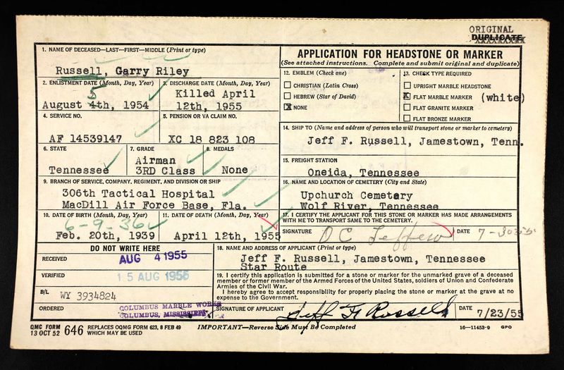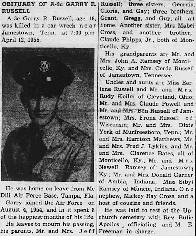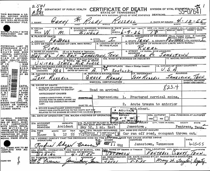 Garry Russell was the son of Jeff Russell and Grace Ramsey. He died at the age of 18 at Jamestown, Fentress County, Tennessee due to a car accident. His car ran off the road and he was thrown out. He was buried on 15 April 1955 at Upchurch Cemetery, Fentress County in Tennessee.