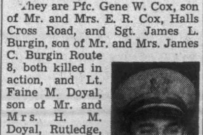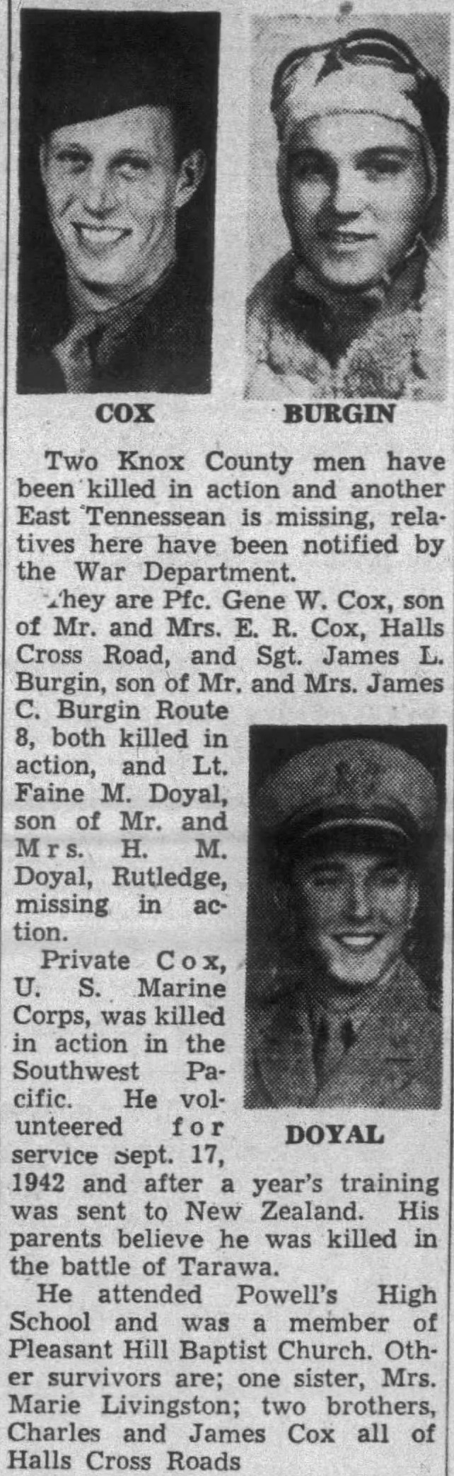 Pfc. Gene W. Cox, U.S. Marine Corps, son of Mr. and Mrs. E.R. Cox, Halls Cross Road, was killed in action in the Southwest Pacific. He volunteered for serv Sept. 17, 1942 and after a year’s training was sent to New Zealand. His parents believe he was killed in the battle of Tarawa. He attended Powell’s High School and was a member of Pleasant Hill Baptist Church. Other survivors are; one sister, Mrs. Marie Livingston; two brothers, Charles and James Cox all of Halls Cross Roads.