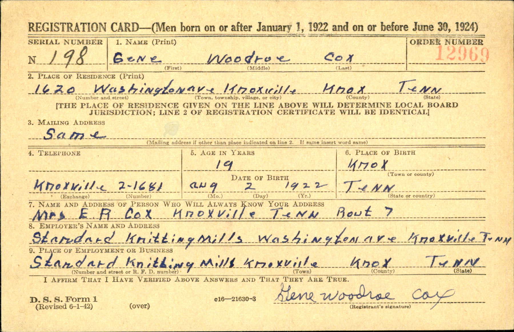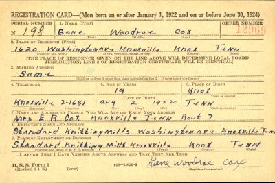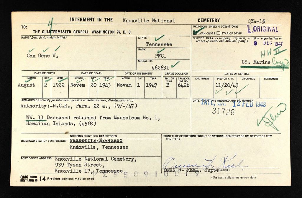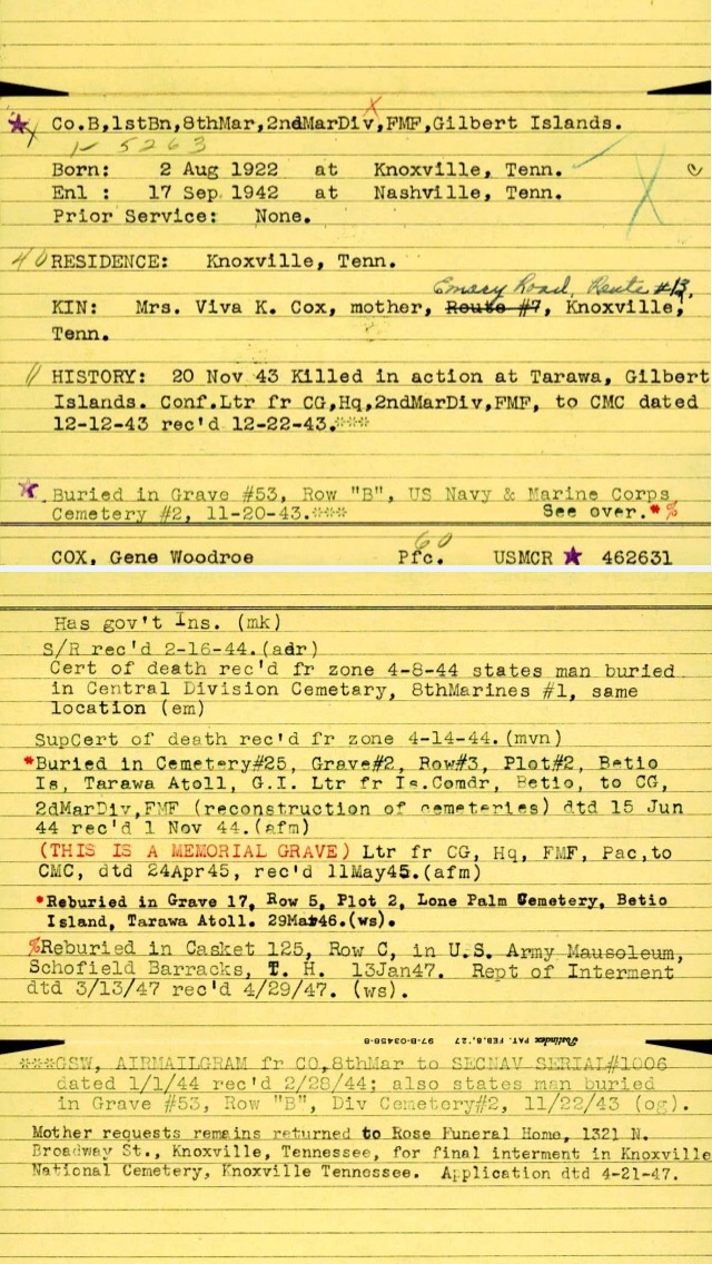 Gene Woodrow Cox was the son of Earnest R. and Viva Cox. He was killed in action on Tarawa Atoll, Gilbert Islands and was returned from Mausoleum No. 1, Hawaiian Islands in 1947. He is buried in Knoxville National Cemetery on November 1, 1947 (Section B Plot 6426)
