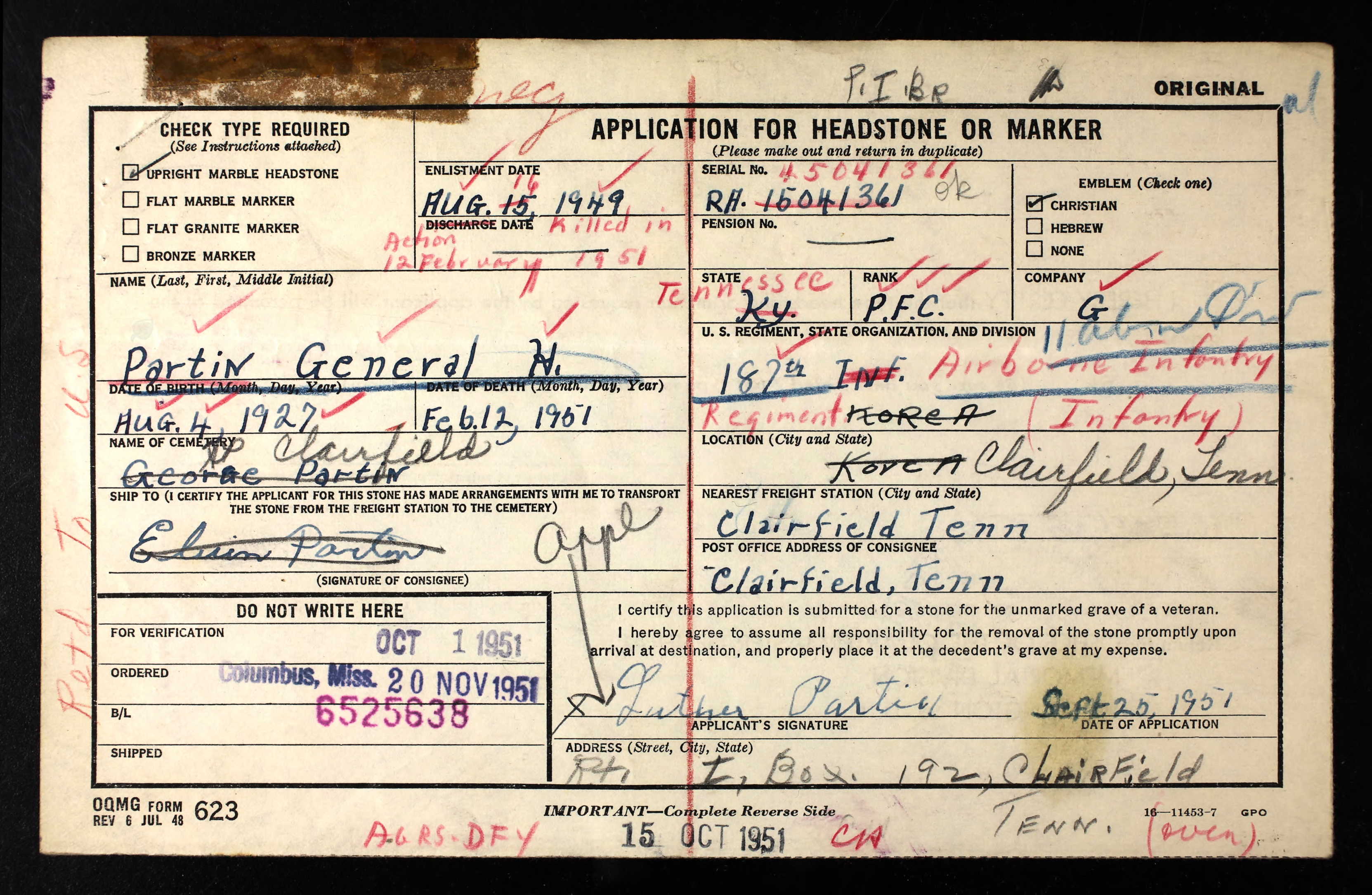 Private First Class Partin was a member of the 187th Regimental Airborne Infantry Combat Team. He was Killed in Action during the Hoengseong massacre, fighting the enemy in South Korea on February 12, 1951.