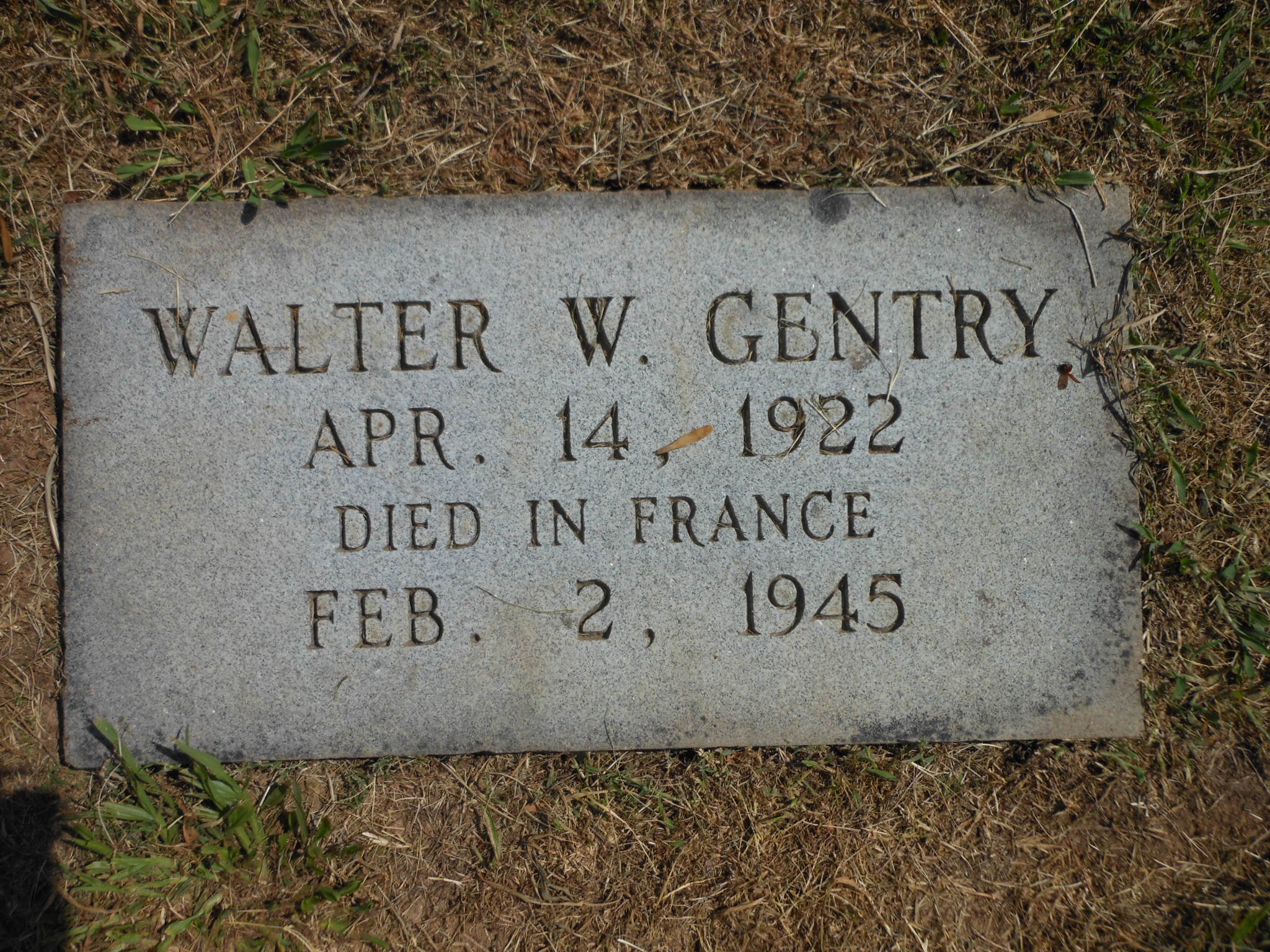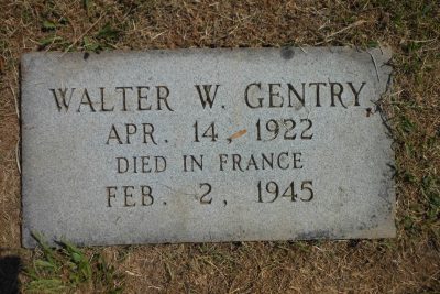 Walter W. Gentry was born on 14 April 1922 in Tennessee. He was the son of Samuel Walter Gentry and Lois Welch. He was killed in action on 2 February 1945 in the French Alps while serving with the Seventh Army. He served with a unit of combat engineers. Lt Gentry is buried at Greenwood Cemetery in Knoxville, Tennessee.