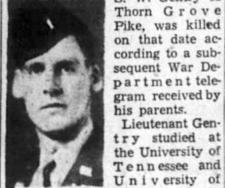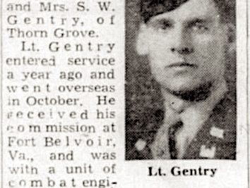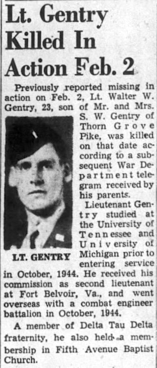 Previously reported missing in action on Feb. 2, Lt. Walter W. Gentry, 23, son of Mr. and Mrs. S.W. Gentry of Thorn Grove Pike, was killed on that date according to a subsequent War Department telegram received by his parents. Lieutenant Gentry studied at the University of Tennessee and University of Michigan prior to entering service in October, 1944. He received his commission as second lieutenant at Fort Belvoir, Va., and went overseas with a combat engineer battalion in October, 1944. A member of Delta Tau Delta fraternity, he also held a membership in Fifth Avenue Baptist Church.