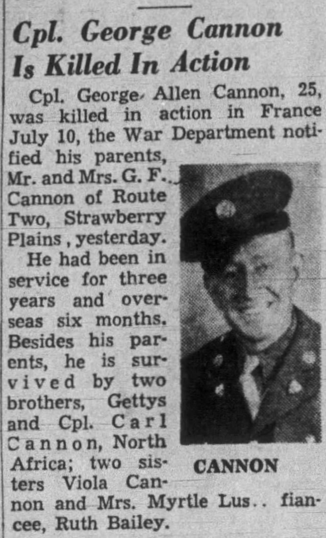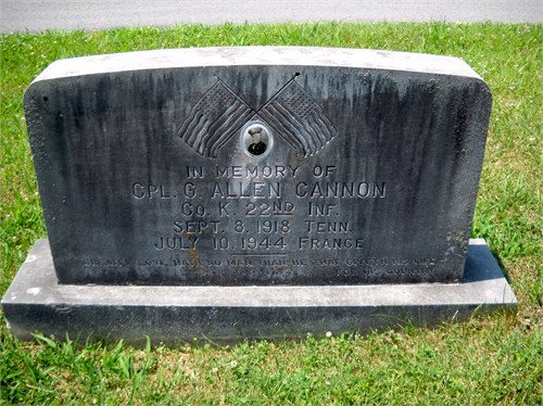 George A. Cannon died in Cherbourg, France after the D-Day invasion in June 1944. He was in the 22nd Infantry Regiment, 4th Infantry Division, 3rd Battalion, Company K.