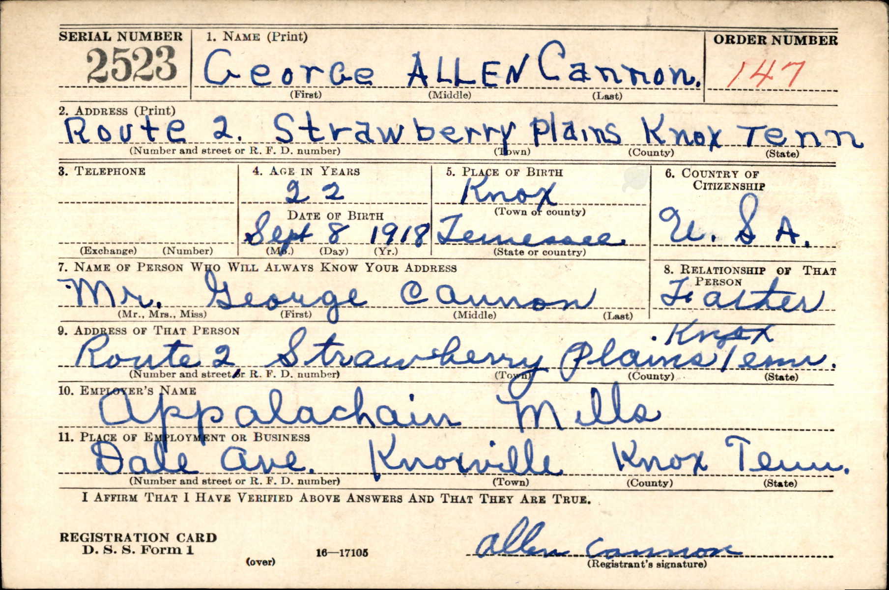 George Alan Cannon was born on 8 September 1918 in Knox County, Tennessee, the son of George Franklin Cannon and Mary Jane Arms (in photo with him). He had two brothers, Gettys Cannon and Cpl. Carl Cannon and two sisters, Viola Cannon and Myrtle Cannon.
