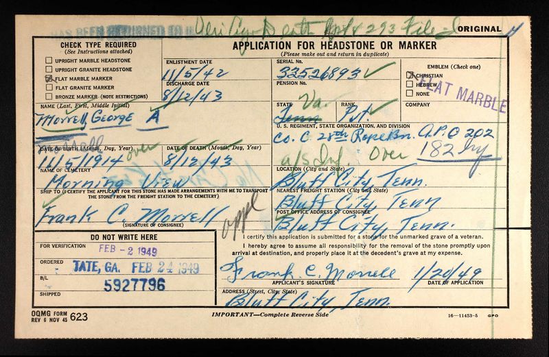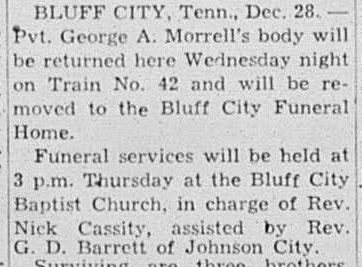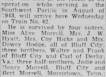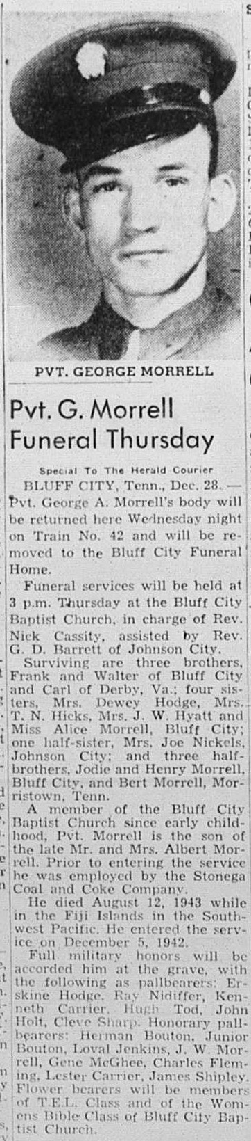 Bluff City, Tenn., Dec. 26 – The body of Pvt. George A. Morrell, who died as the result of an operation while serving in the Southwest Pacific in August of 1943, will arrive here Wednesday on Train No. 42. He is survived by four sisters, Miss Alice Morrell, Mrs. J.W. Hyatt, Mrs. Coy Hicks and Mrs. Dewey Hodge, all of Bluff City; three brothers, Walter and Frank of Bluff City and Carl of Derby, Va.; three half-brothers, Jodie and Henry Morrell, Bluff City and Bert Morrell, Morristown, Tenn.; and one half –sister, Mrs. Joe Nichels of Johnson City, Tenn.