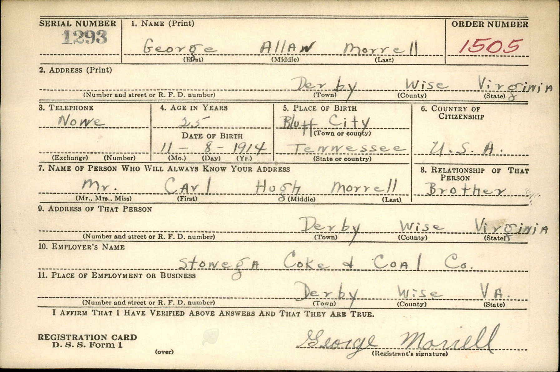 George Allan Morrell was born on 5 November 1914 in Bluff City, Tennessee. He was the son of Albert Miller Morrell and Jennie Barnett.