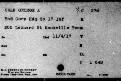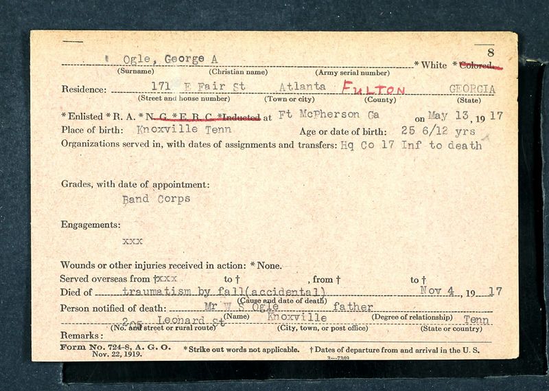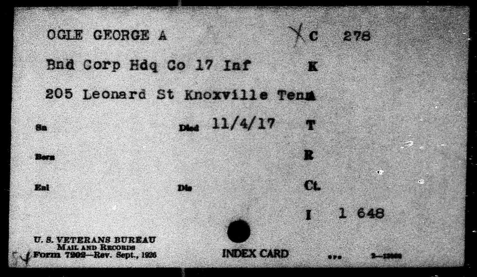 George Arthur Ogle volunteered his services to the U.S. Army in May 1917. As a member of Headquarters Company, 17th Infantry, was stationed at Fort Oglethorpe, GA. Corporal Ogle was accidentally killed in an army truck wreck, in the line of duty, November 4, 1917.