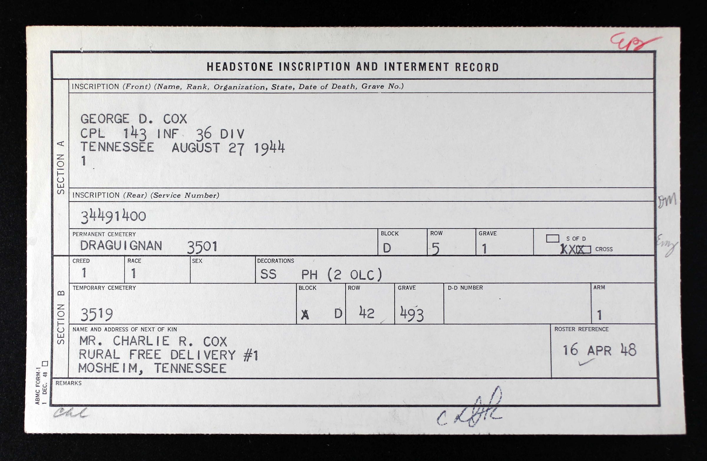 Cpl Cox was killed in action on 27 August 1944. He is interred at the Rhone American Cemetery, Draguignan, France, located at D,5,1.