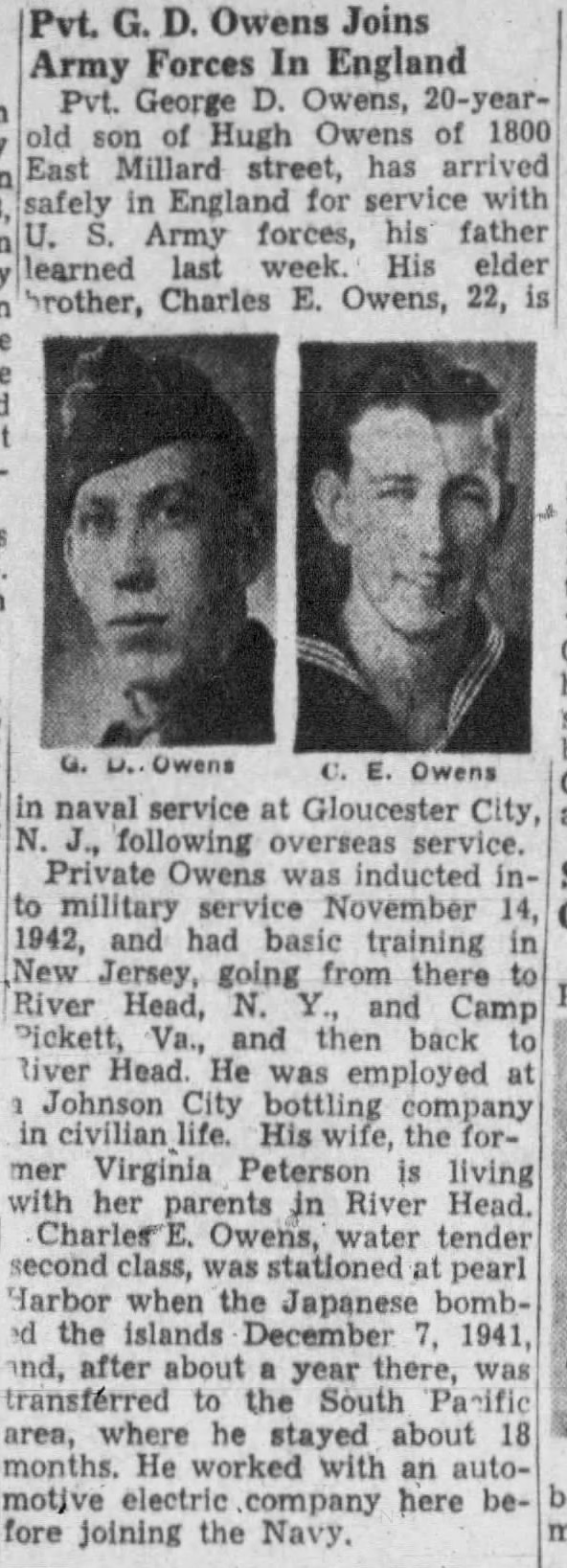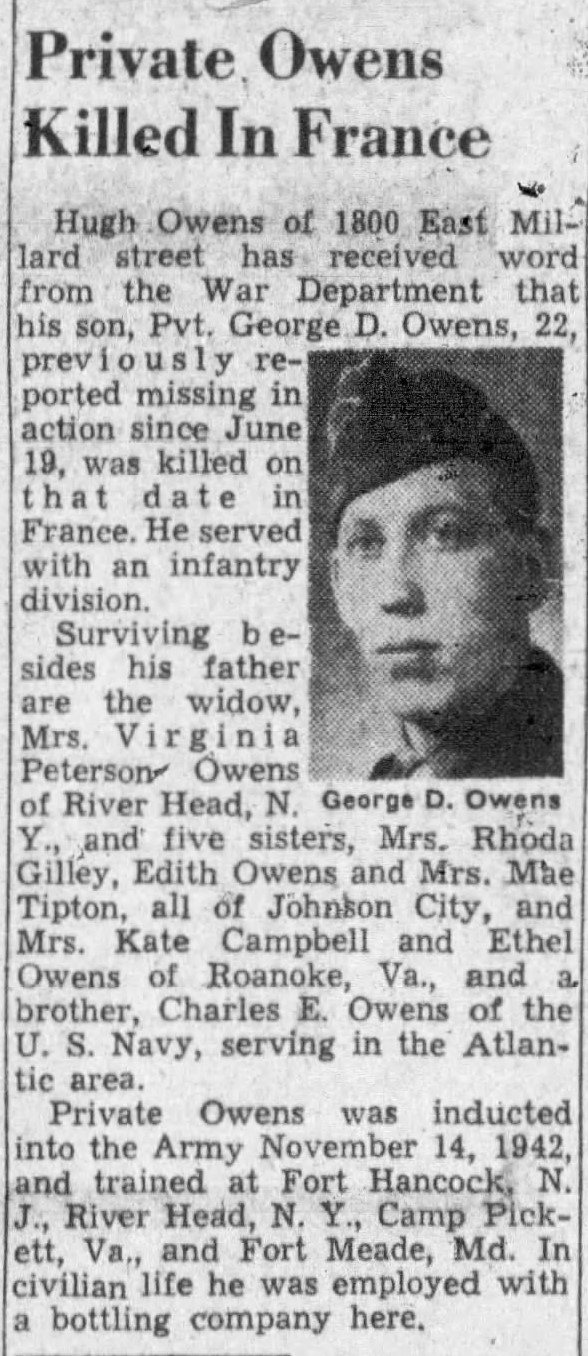Hugh Owens of 180 East Millard street has received word from the War Department that his son, Pvt. George D. Owens, 22, previously reported missing in action since June 17, was killed on that date in France. He served with a infantry division. Surviving besides his father are the widow, Mrs. Virginia Peterson Owens of River Head, N.Y., and five sisters, Mrs. Rhoda Gilley, Edith Owens and Mrs. Mae Tipton, all of Johnson City, and Mrs. Kate Campbell and Ethel Owens of Roanoke, Va., and a brothers, Charles E. Owens of the U.S. Navy, serving in the Atlantic area. Private Owens was inducted into the Army November 14, 1942, and trained at Fort Hancock, N.J., River Head, N.Y., Camp Pickett, Va., and Fort Meade, Md. In civilian life he was employed with a bottling company here.