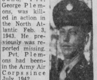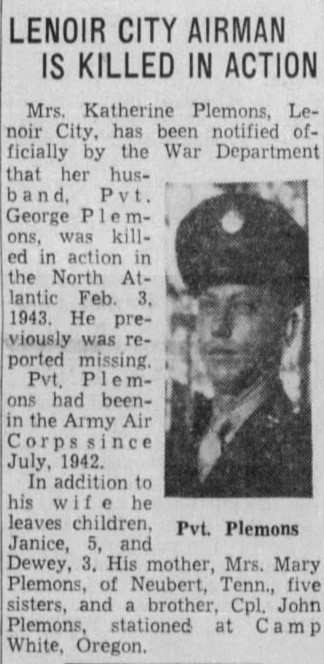 Mrs.Katherine Plemons, Lenoir City, has been notified officially by the War Department that her husband, Pvt. George Plemons, was killed in action in the North Atlantic Feb. 3, 1943. He previously was reported missing. Pvt. Plemons had been in the Army Air Corps since July, 1942. In addition to his wife, he leaves children, Janice, 5, and Dewey, 3. His mother, Mrs. Mary Plemons, of Neubert, Tenn., five sisters and a brother, Cpl. John Plemons, Stationed at Camp White, Oregon.