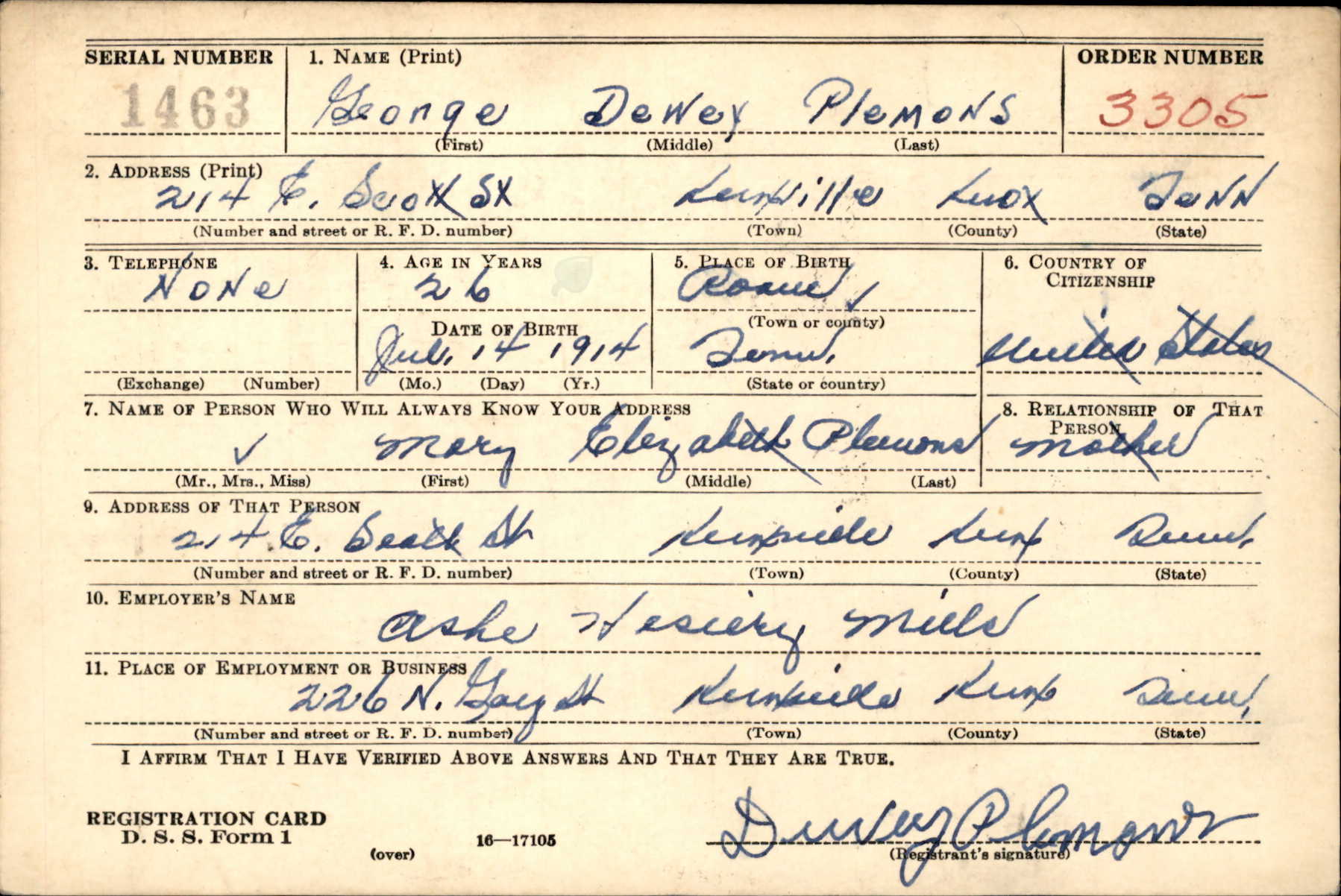 George Plemons resided at Buncombe, North Carolina and entered the service on 30 July 1942 at Fort Jackson, Columbia, South Carolina. He probably was lost in the sinking of the S.S. Dorchester. The Dorchester was torpedoed by German U-boat U-223 during the early morning hours of February 3, 1943.