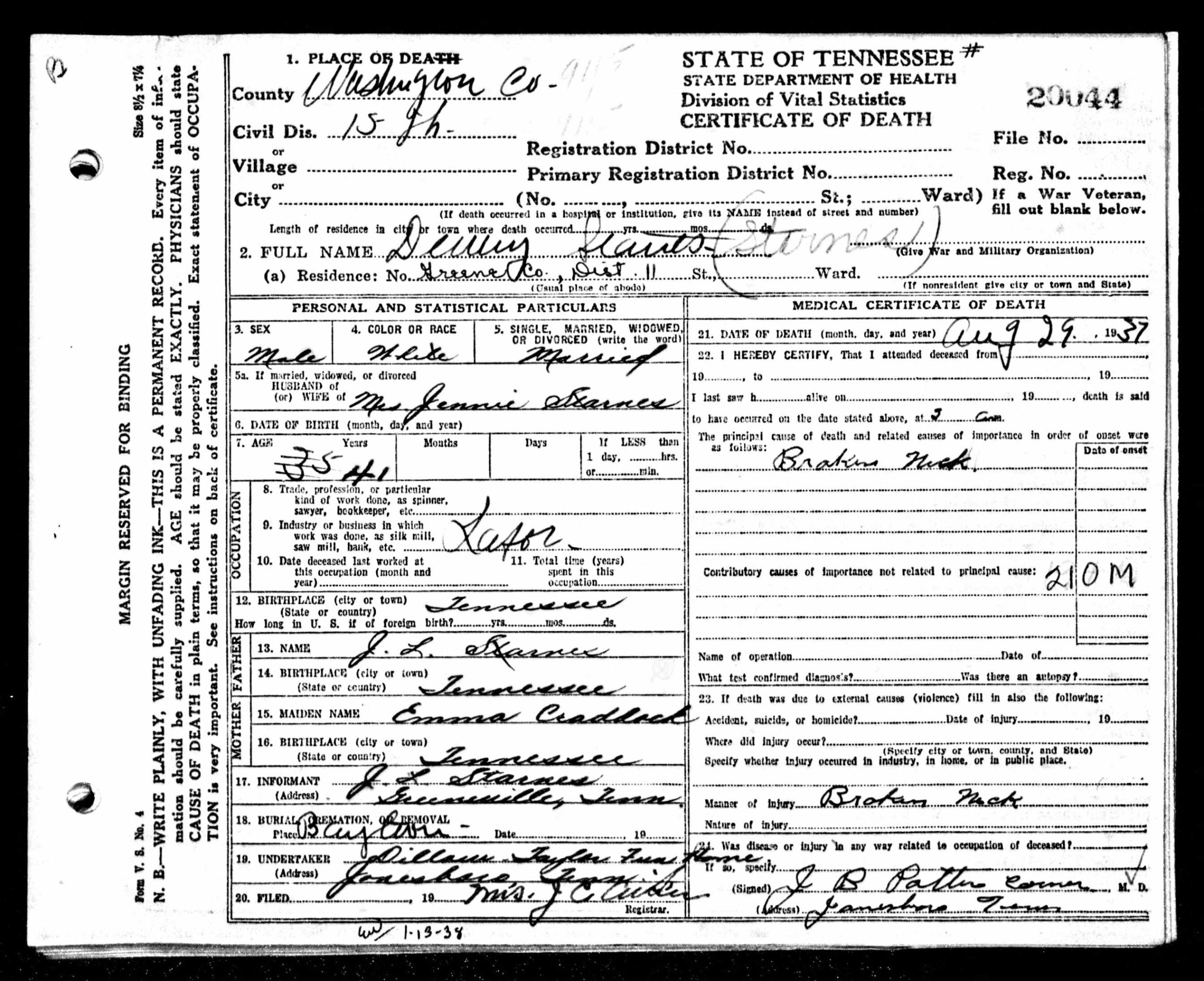 Dewey Starnes, agen 41, was killed instantly Saturday night at 11:30 when the car in which he was riding crashed into a fence post on the Andrew Johnson Highway near Limestone. His neck was broken and chest crushed. Harrison Payne, 30, of Greeneville, who was driving the car, was arrested on a charge of manslaughter and was placed in the Jonesboro jail. His preliminary hearing was set for this afternoon. Tom Malone, another occupant of the car was held for an investigation, but it is understood that he has been released. The car, a Chevrolet Sedan, was badly damaged.