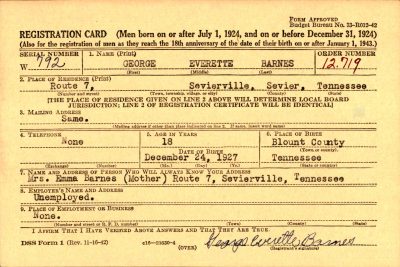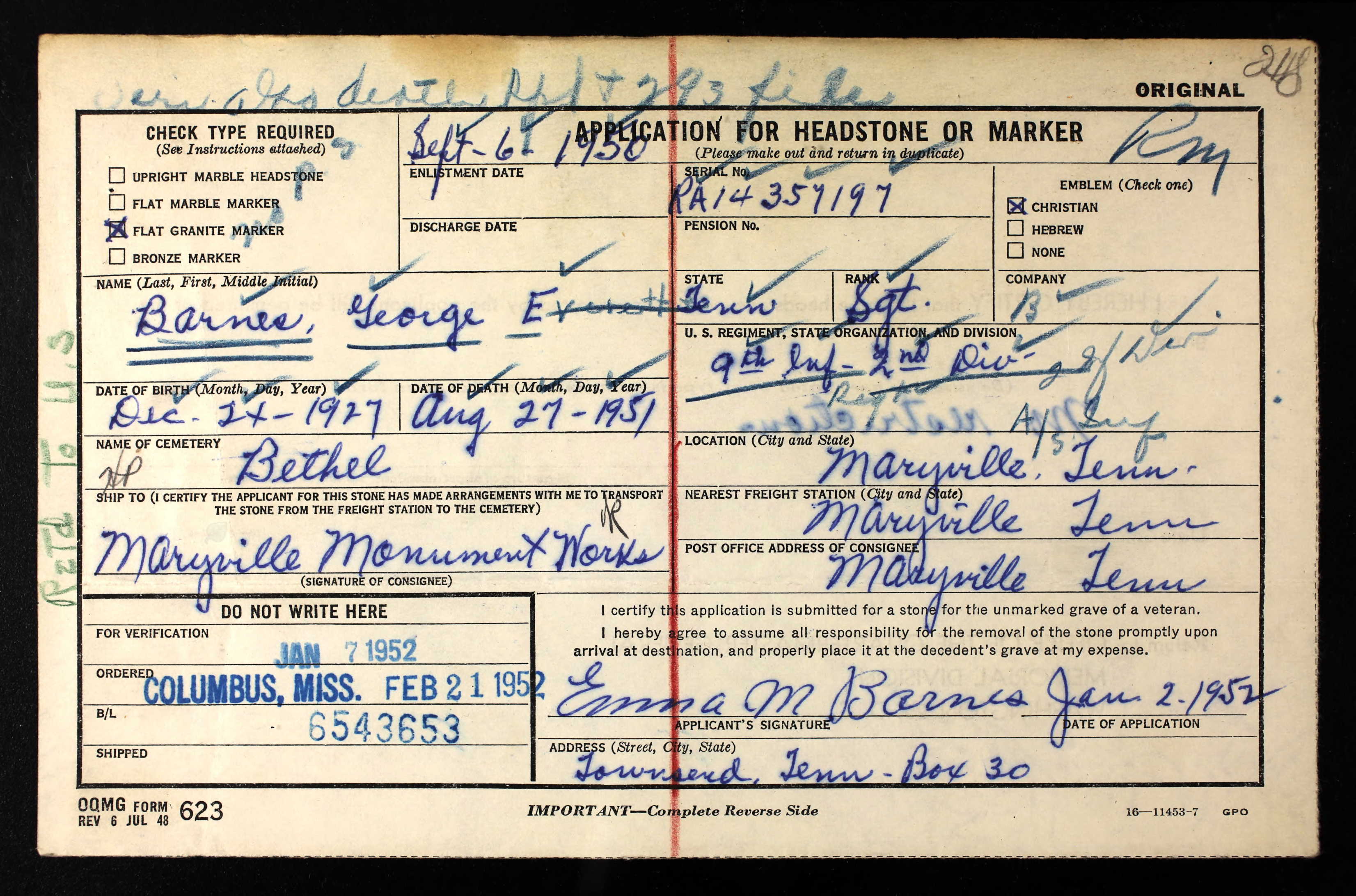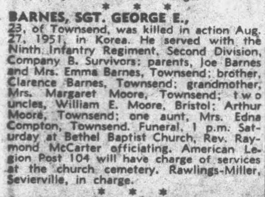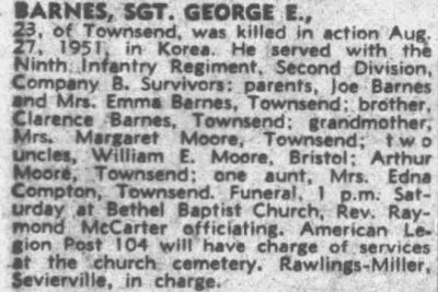 Sgt. George E. Barnes, 23, of Townsend, was killed in action Aug. 27, 1951 in Korea. He served with the Ninth Infantry Regiment, Second Division, Company B. Survivors, parents, Joe Barnes and Mrs. Emma Barnes, Townsend; brother, Clarence Barnes, Townsend; grandmother, Mrs. Margaret Moore, Townsend; two uncles, William E. Moore, Bristol; Arthur Moore, Townsend; one aunt, Mrs. Edna Compton
