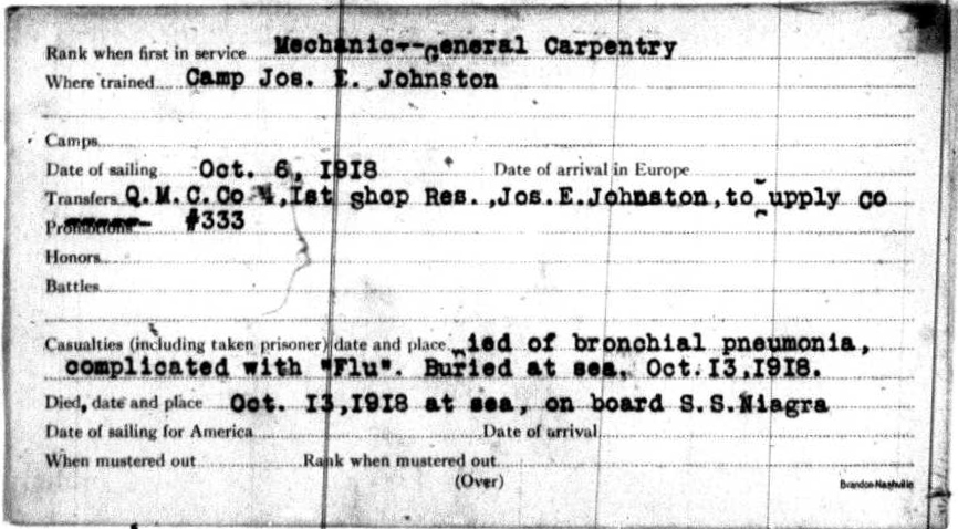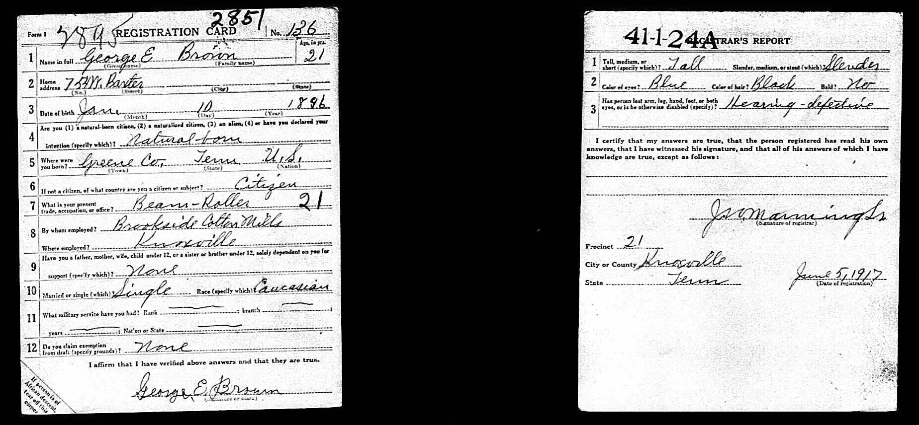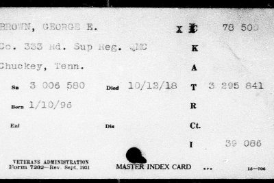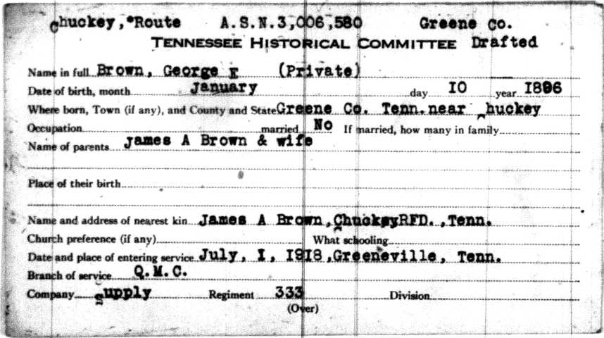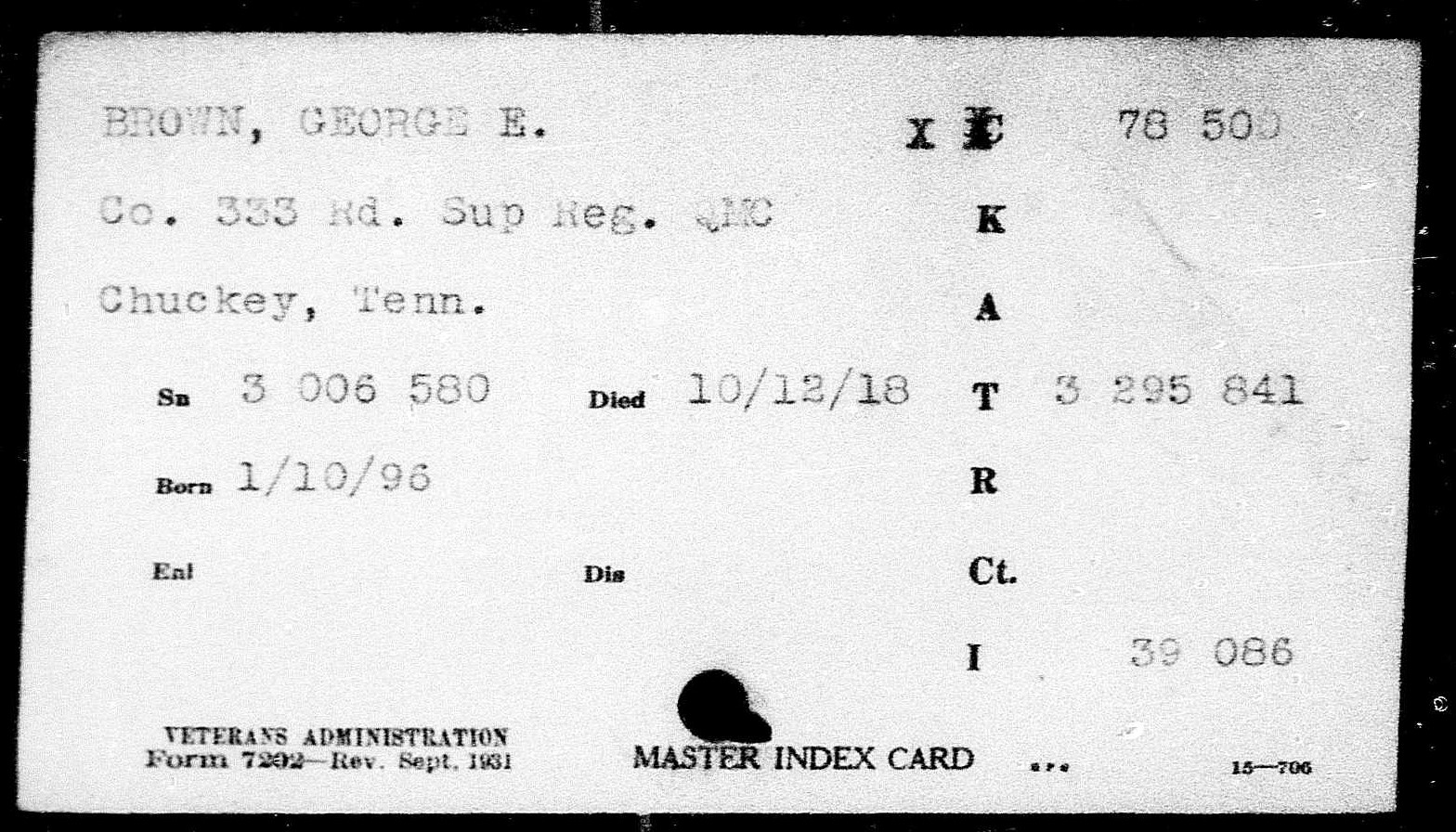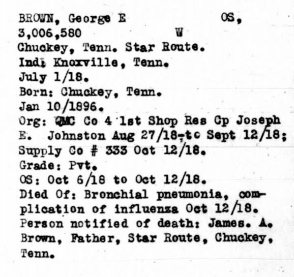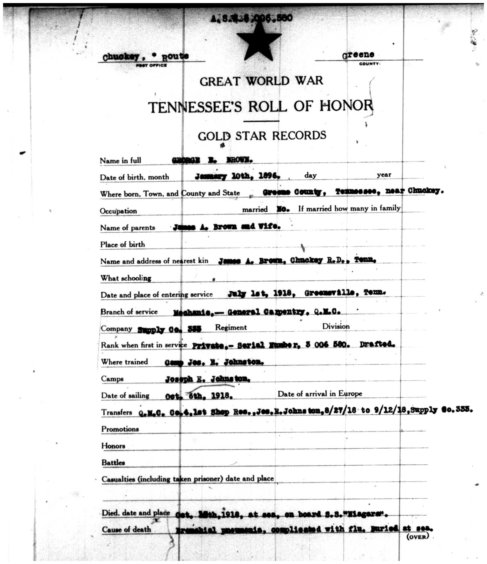 George E. Brown was born in 1896 at Chuckey, Tennessee. He died on 12 October 1918 of bronchial pneumonia complicated with flu and was buried at sea on board S.S. Niagra. Pvt Brown and is listed on the Tablets of the Missing at Suresnes American Cemetery, Suresnes, France.