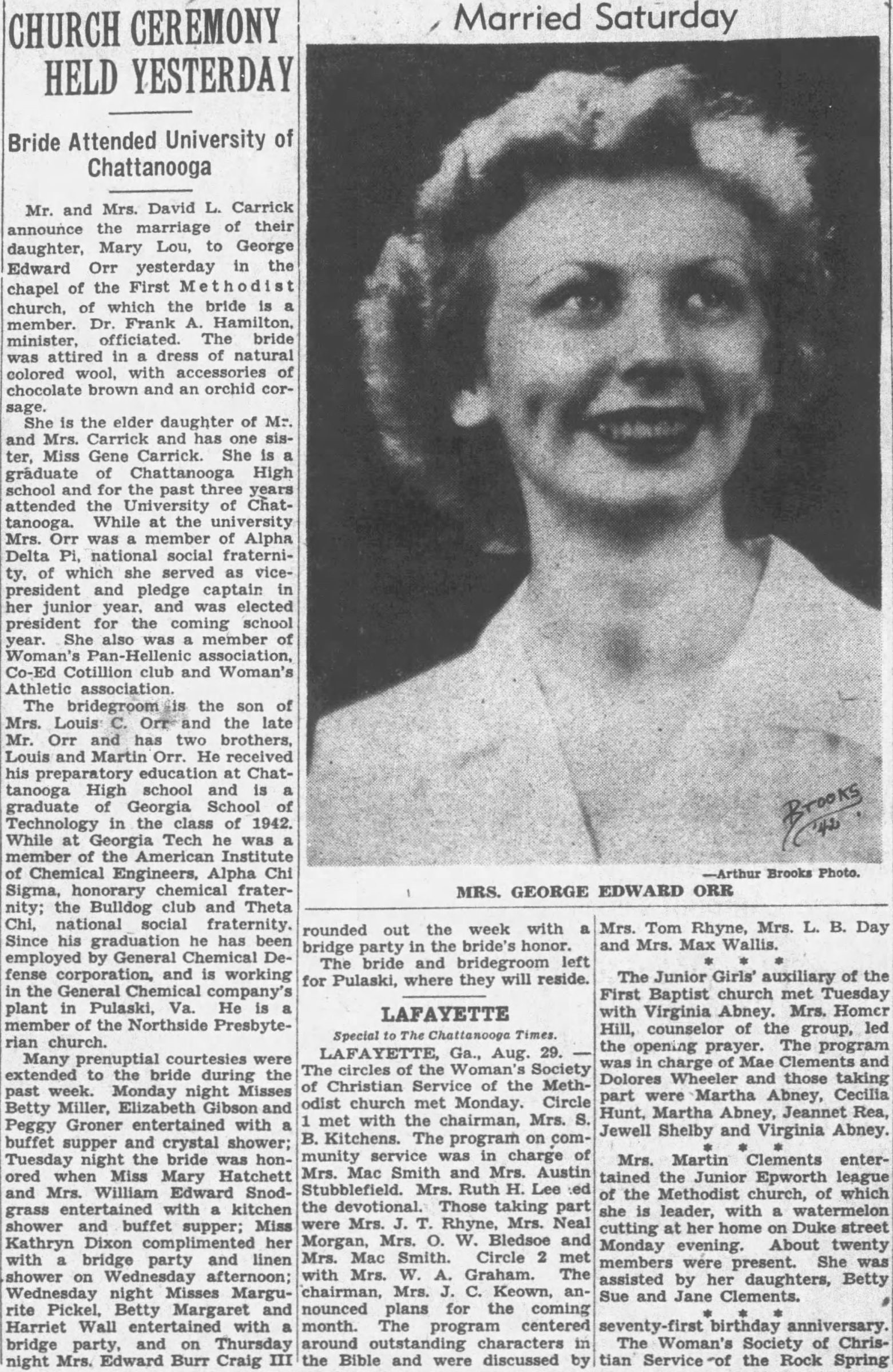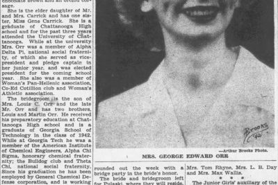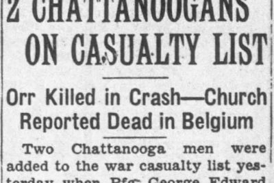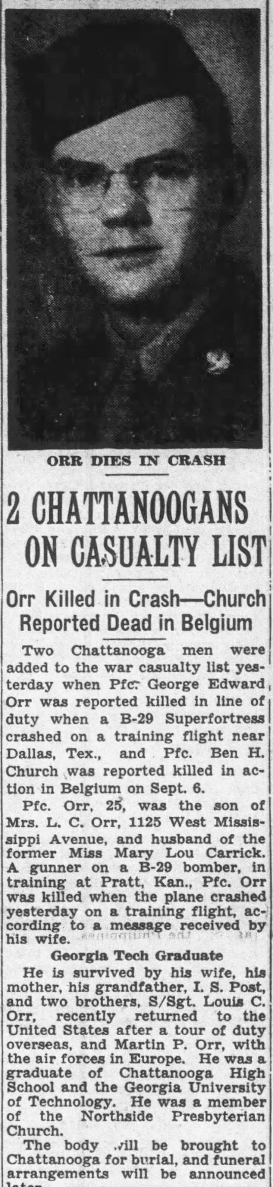 Pfc. George Edward Orr was reported killed in line of duty when a B-29 Superfortress crashed on a training flight near Dallas, Texas. Pfc. Orr, 25, was the son of Mrs. L.C. Orr, 1125 West Mississippi Avenue, and husband of the former Mary Lou Carrick. A gunner on a B-29 bomber, in training at Pratt, Kan., Pfc. Orr was killed when the plane crashed yesterday on a training flight, according to a message received by his wife. He is survived by his wife, his mother, his grandfather, I.S. Post, and two brothers, S/Sgt Louis C. Orr, recently returned to the United States after a tour of duty overseas, and Martin P. Orr, with the air forces in Europe. He was a member of the Northside Presbyterian Church. The body will be brought to Chattanooga for burial, and funeral arrangements will be announced later.