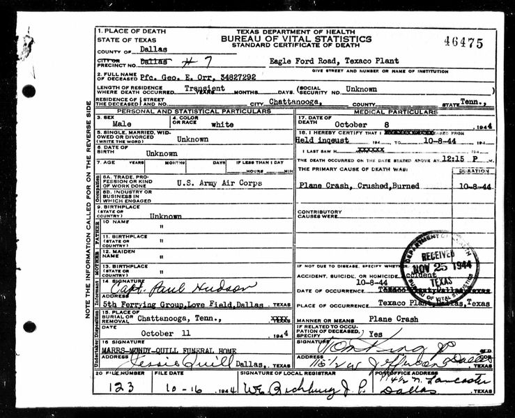 PFC Orr died at Eagle Ford Road, Texaco Plant, Dallas County, Texas due to a plane crash.