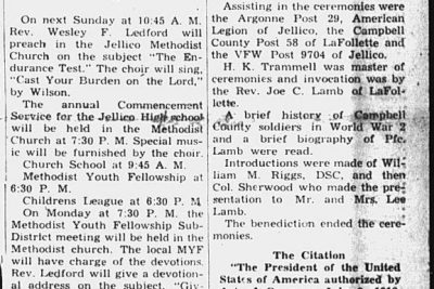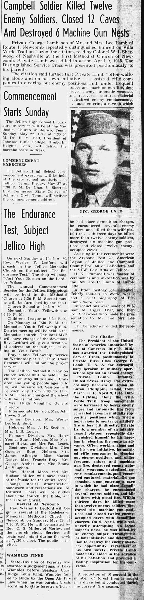 Private George Lamb, son of Mr. and Mrs. Lee Lamb of Route 1, Newcomb repeatedly distinguished himself on Ville Verde Trail on Luzon, the citation, read by Colonel W.I.. Sherwood of Nashville at the First Methodist Church of Newcomb. Private Lamb was killed in action April 9, 1945. The Distinguished Service Cross was presented posthumously to his parents. The citation said further that Private Lamb “often working alone and on his own initiative… assisted rifle companies in clearing out enemy positions, and, under frequent sniper and machine gun fire, destroyed enemy automatic weapons, and recovered captured material, neutralized enemy emplacements, … upon entering a cave in which he had place demolition charges, he encoutered several enemy soldiers, and killed them with pistol fire… thirteen days he killed more than twelve enemy soldiers, destroyed six machine gun positions and closed twelve enemy occupied caves…”.