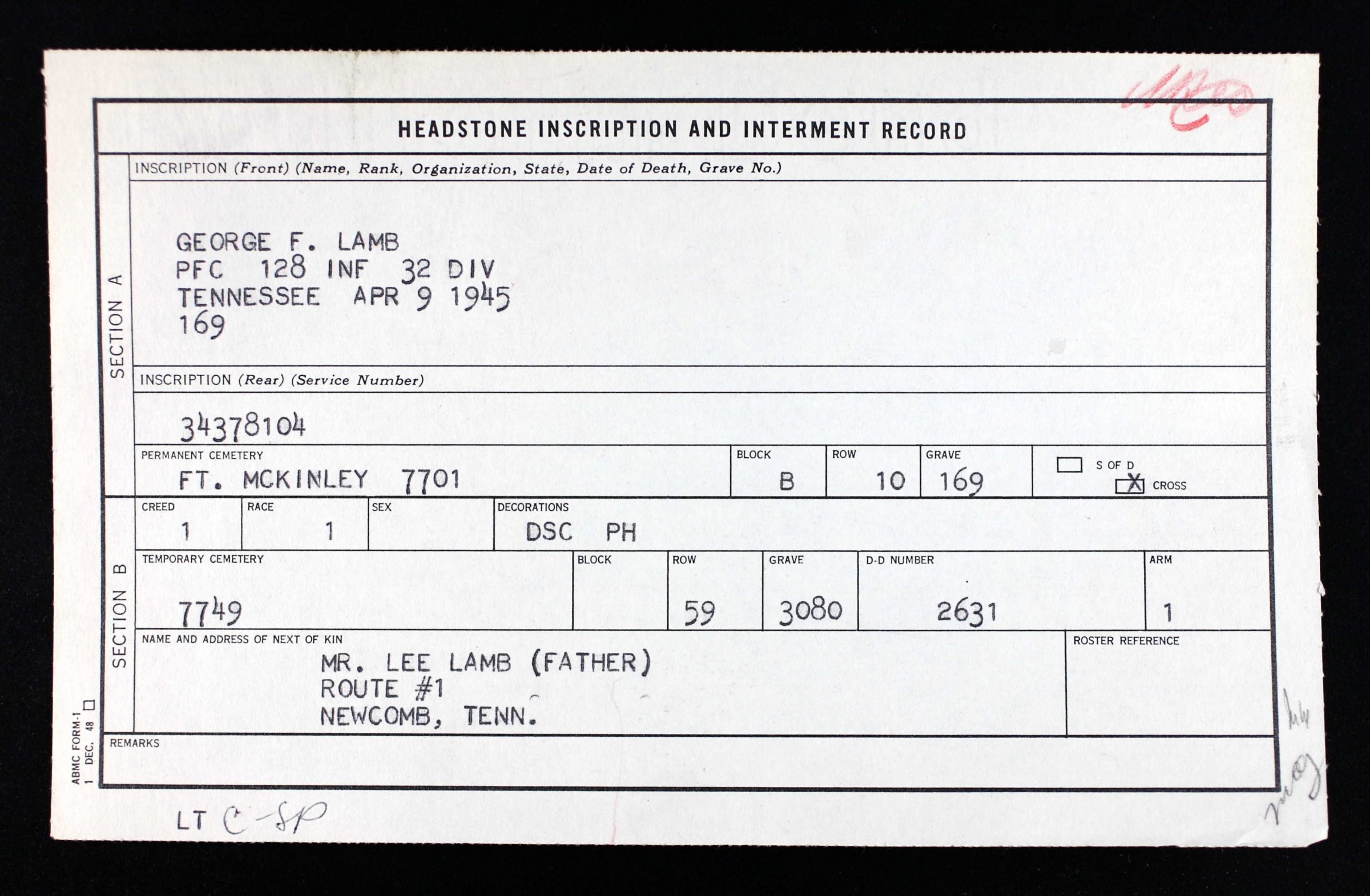 “Private First Class George F. Lamb was awarded the Distinguished Service Cross (posthumously) for extraordinary heroism in connection with military operations against an armed enemy while serving with the 128th Infantry Regiment, 32nd Infantry Division, in action against enemy forces from 28 March to 9 April 1945. Private First Class Lamb’s intrepid action, personal bravery and zealous devotion to duty at the cost of his life, exemplify the highest traditions of the military forces of the United States and reflect great credit upon himself, the 32nd Infantry Division, and the United States Army.”