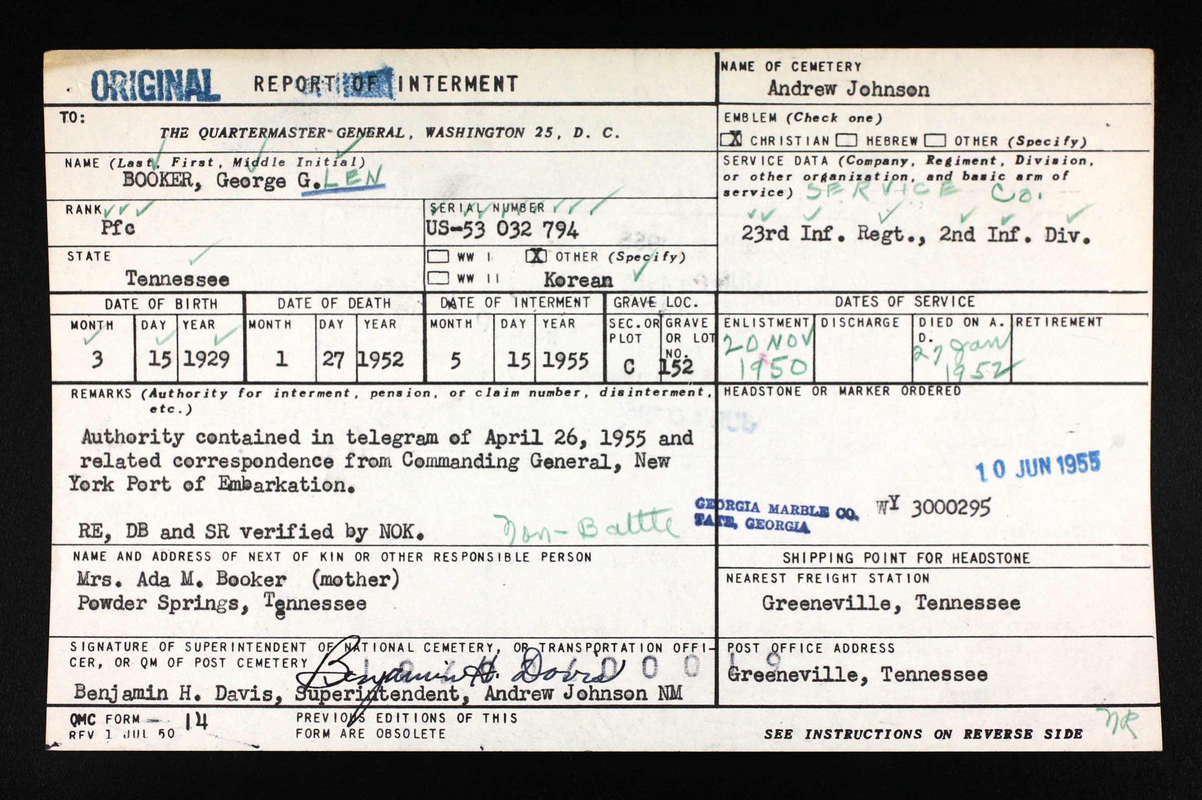Private First Class Booker was a member of the 23rd Infantry Regiment, 2nd Infantry Division. He was taken prisoner of war while fighting the enemy in South Korea on May 18, 1951, and died while a prisoner on January 27, 1952.