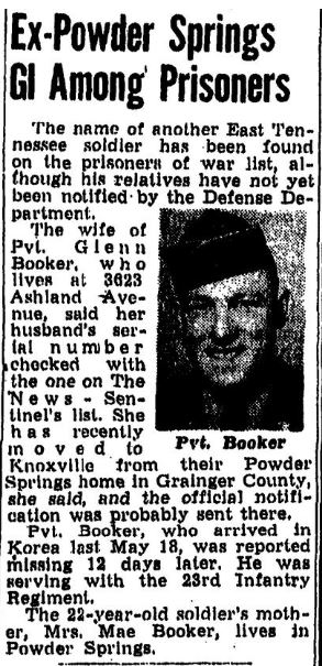The Communists admitted back in December, 1951,that they had captured Pvt. Glenn Booker, but there has never been another word of news concerning him. No mail has ever been received by members of the Powder Springs GI’s family. If repatriated prisoners disclosed his whereabouts, the Army has not yet notified his mother, Mrs. Mae Booker. The soldier, who was 22 when first reported missing, attended Washburn High School. His wife, Mrs. Geneva Booker, formerly of Knoxville, now lives at El Paso, Tex.