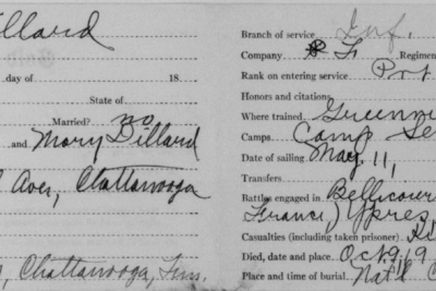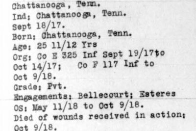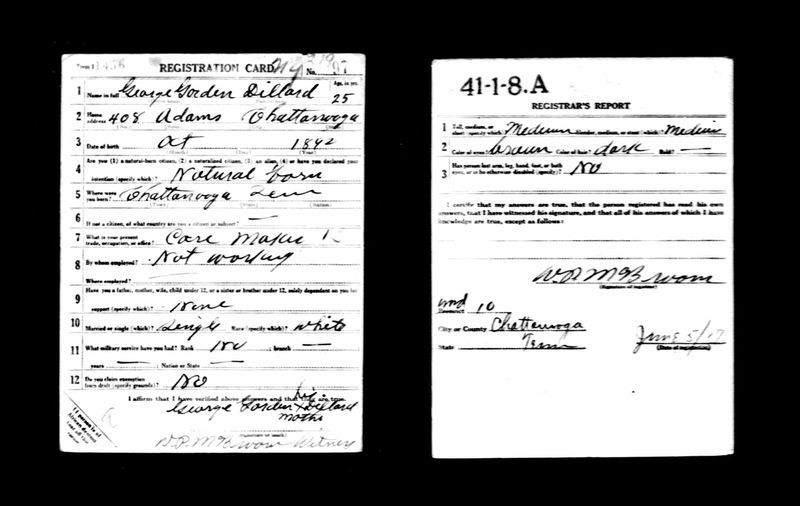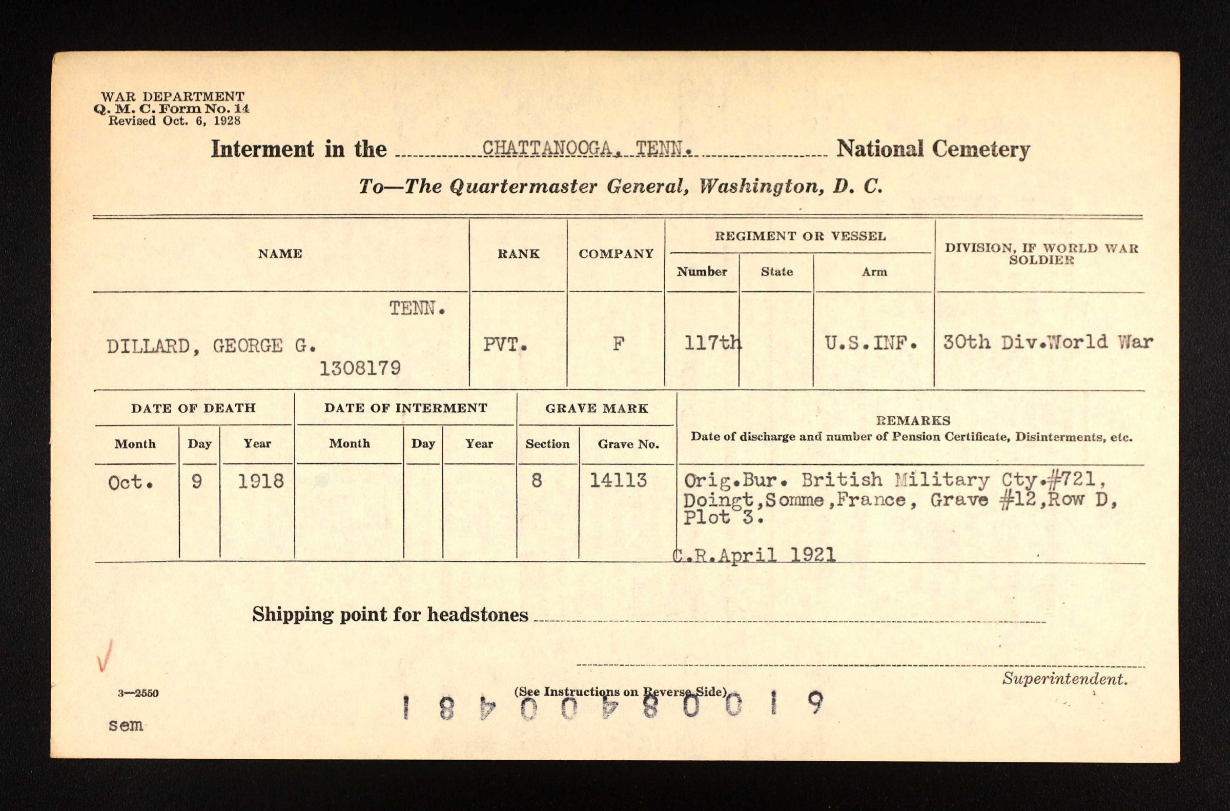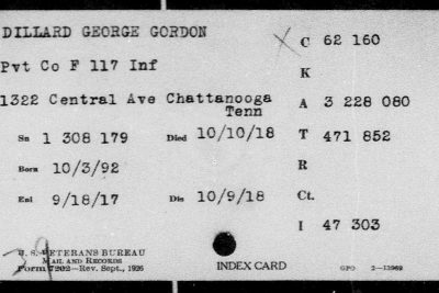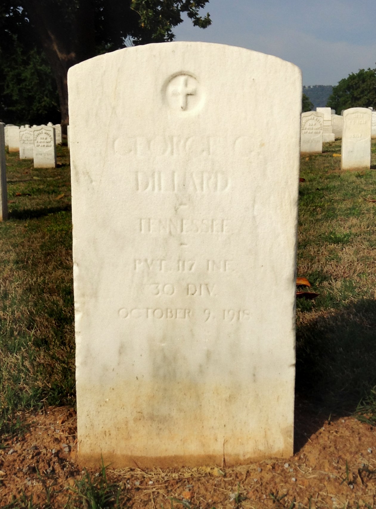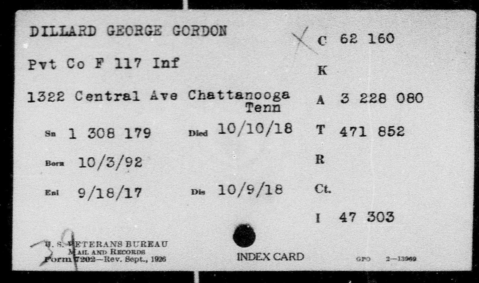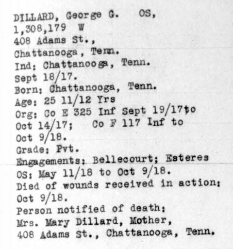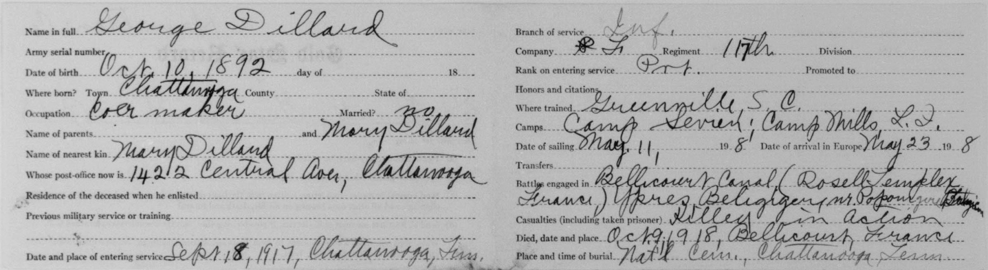 George Gorden Dillard was born in Chattanooga, Tennessee to Mary Dillard. He was killed in action 9 October 1918, during the Battle of Bellicourt in France. Private Dillard was initially buried at the British Military Cemetery, Doingt, Somme, France, Grave 12, Row D, Plot 3.