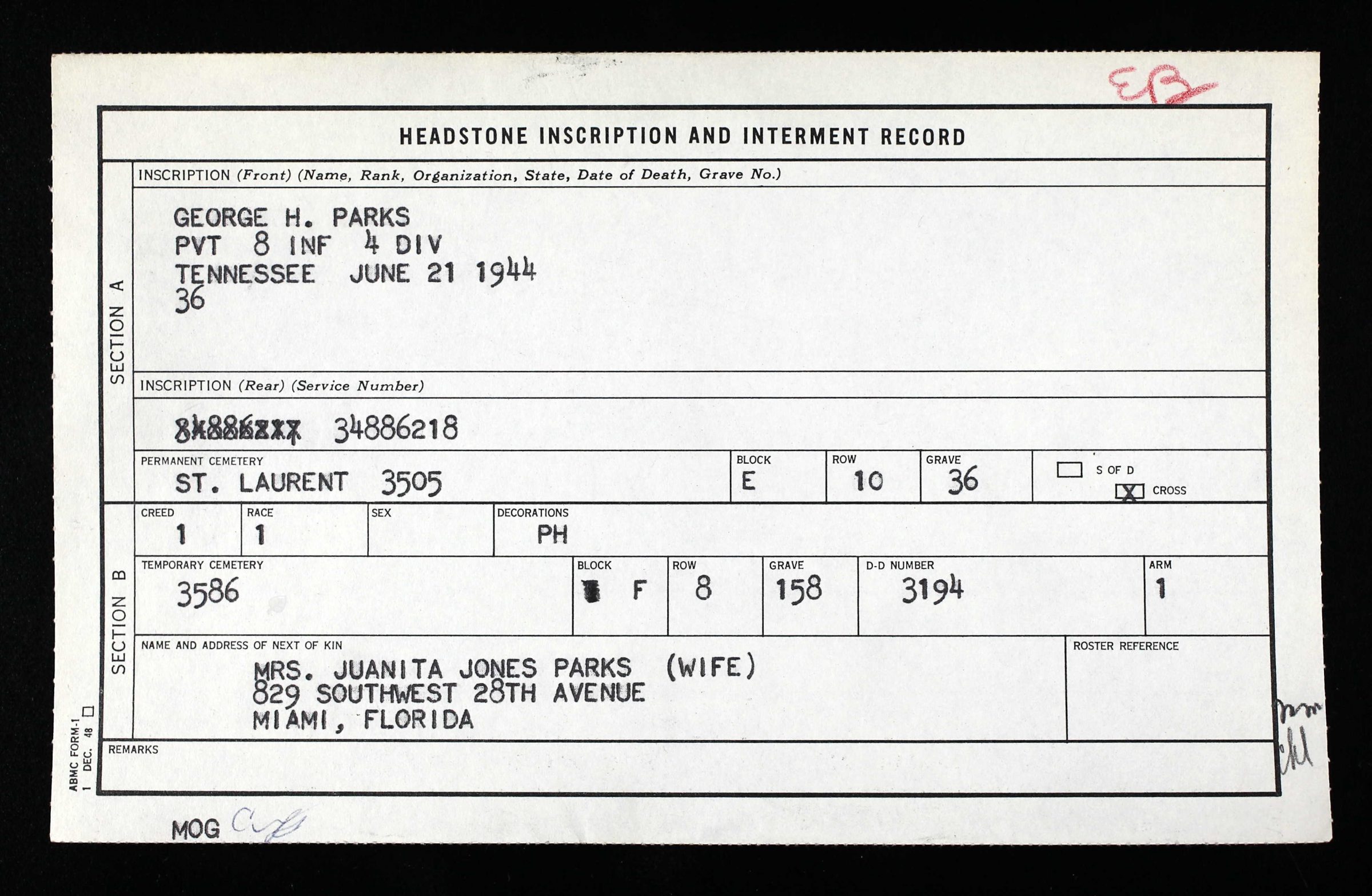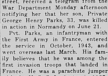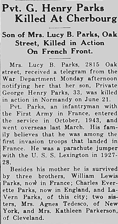 Mrs. Lucy B. Parks, 2815 Oak Street, received a telegram from the War Department Monday afternoon notifying her that her son, Private George Henry Parks, 33, was killed in action in Normandy on June 21. Pvt. Parks, an infantryman with the First Army in France, entered the service in October, 1943, and went overseas last March. His family believes that he was among the first invasion troops that landed in France. He was a parachute jumber with the U.S.S. Lexington in 1927-1928.