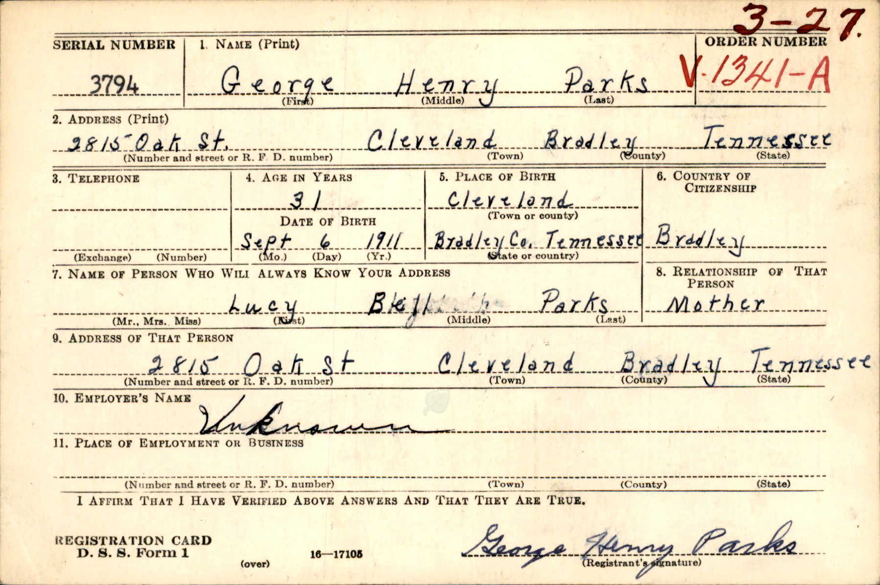 George Henry Parks was born in Cleveland, Tennessee to George Walter Parks and Lucy Belle Dickerson.