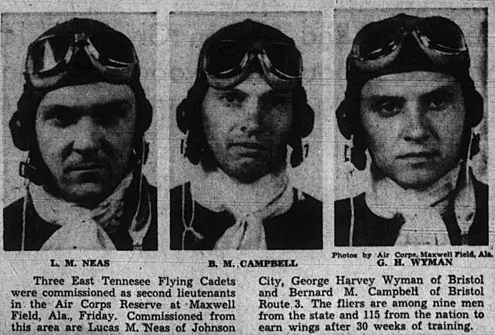 Three East Tennessee Flying Cadets were commissioned as second lieutenants in the Air Corps Reserve at Maxwell Field, Ala., Friday. Commissioned from this area are Lucas M. Neas of Johnson City, George Harvey Wyman of Bristol and Bernard M. Campbell of Bristol, Route 3. The Fliers are among nine men from the state and 115 from the nation to earn wings after 30 weeks of training.